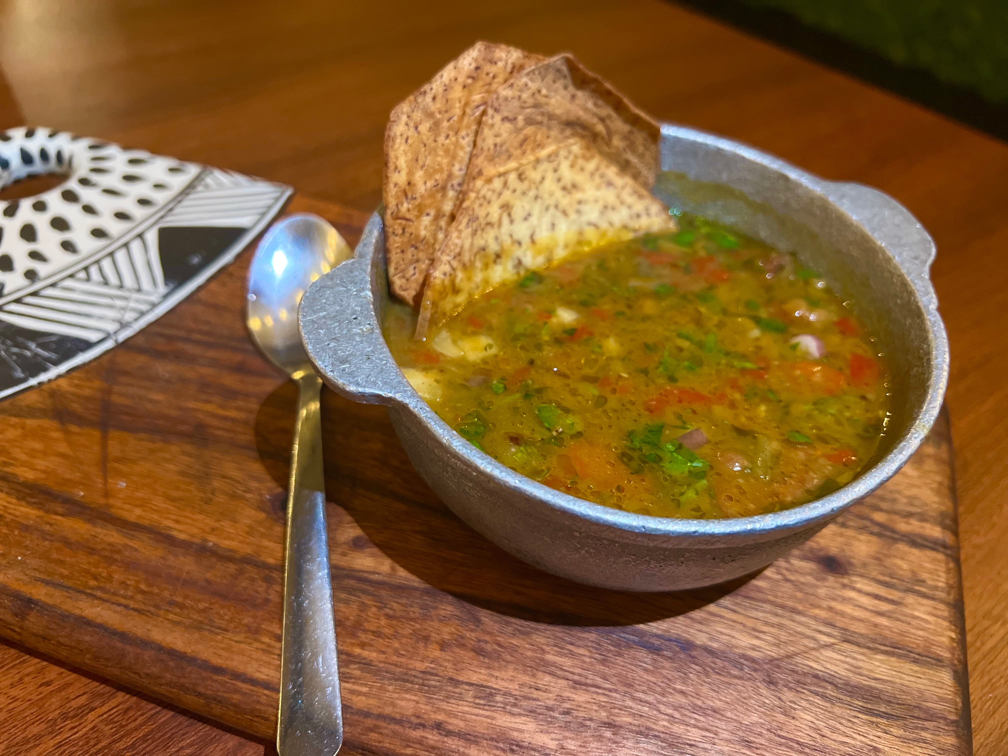 Mesa y Campo Sopa de gandules con chips de malanga.
