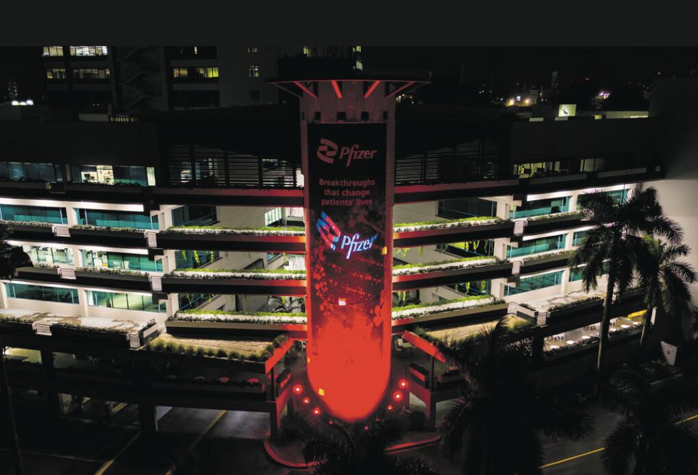 La alianza Bristol Myers Squibb - Pfizer iluminaron sus respectivos edificios de color rojo con el objetivo de concienciar sobre las enfermedades cardiovasculares y en solidaridad con los pacientes afectados por las condiciones cardiacas durante febrero, conocido como el Mes del Corazón.