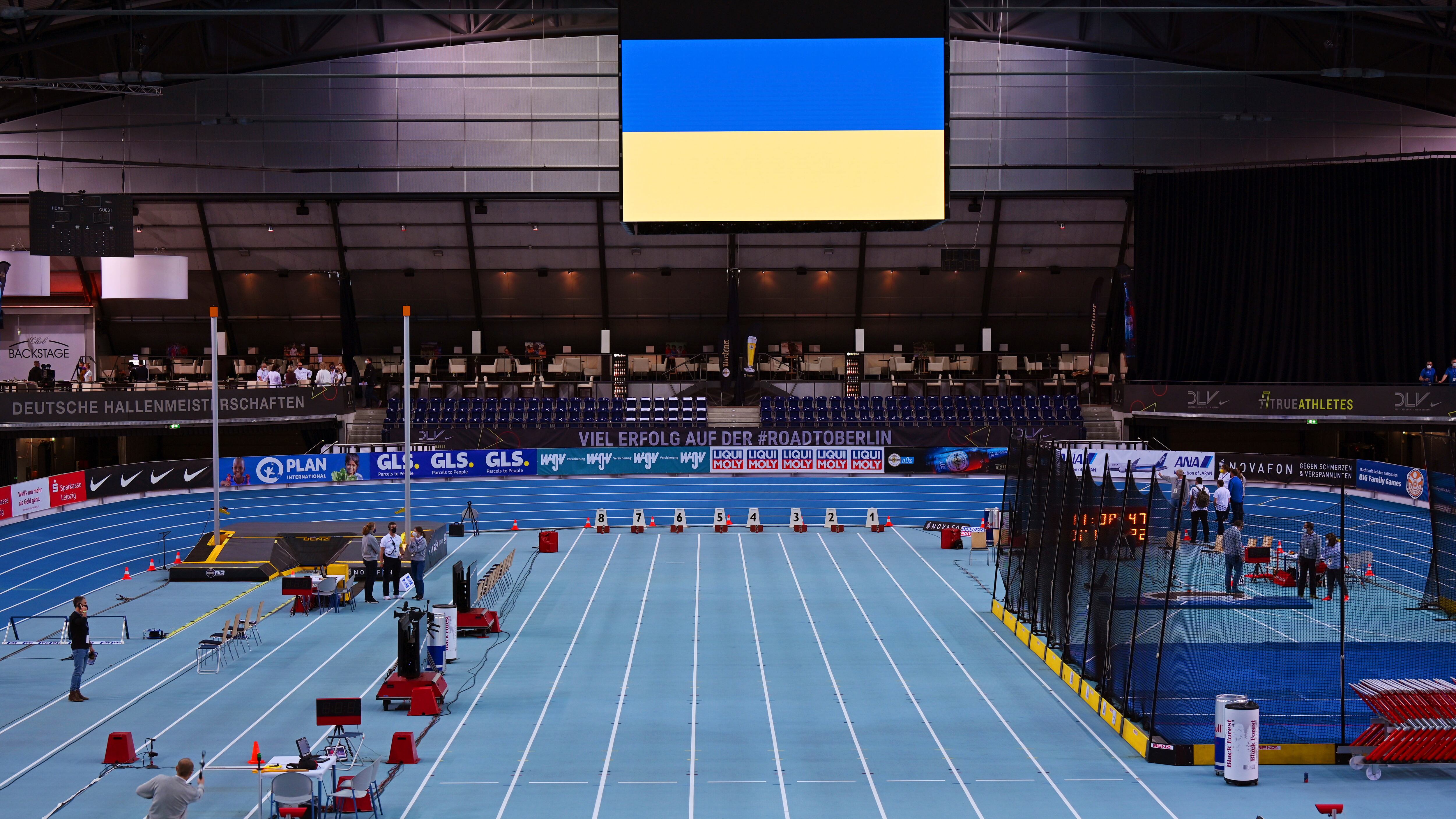 Una pantalla muestra los colores de Ucrania durante una competencia atlética en Leipzig, Alemania, el 26 de febrero del 2022. Aumentan en el ámbito deportivo las condenas a la invasión rusa de Ucrania y los pedidos de sanciones por parte de los organis Una pantalla muestra los colores de Ucrania durante una competencia atlética en Leipzig, Alemania, el 26 de febrero del 2022. Aumentan en el ámbito deportivo las condenas a la invasión rusa de Ucrania y los pedidos de sanciones por parte de los organismos deportivos. (Martin Schutt/dpa vía AP) (Martin Schutt/AP)