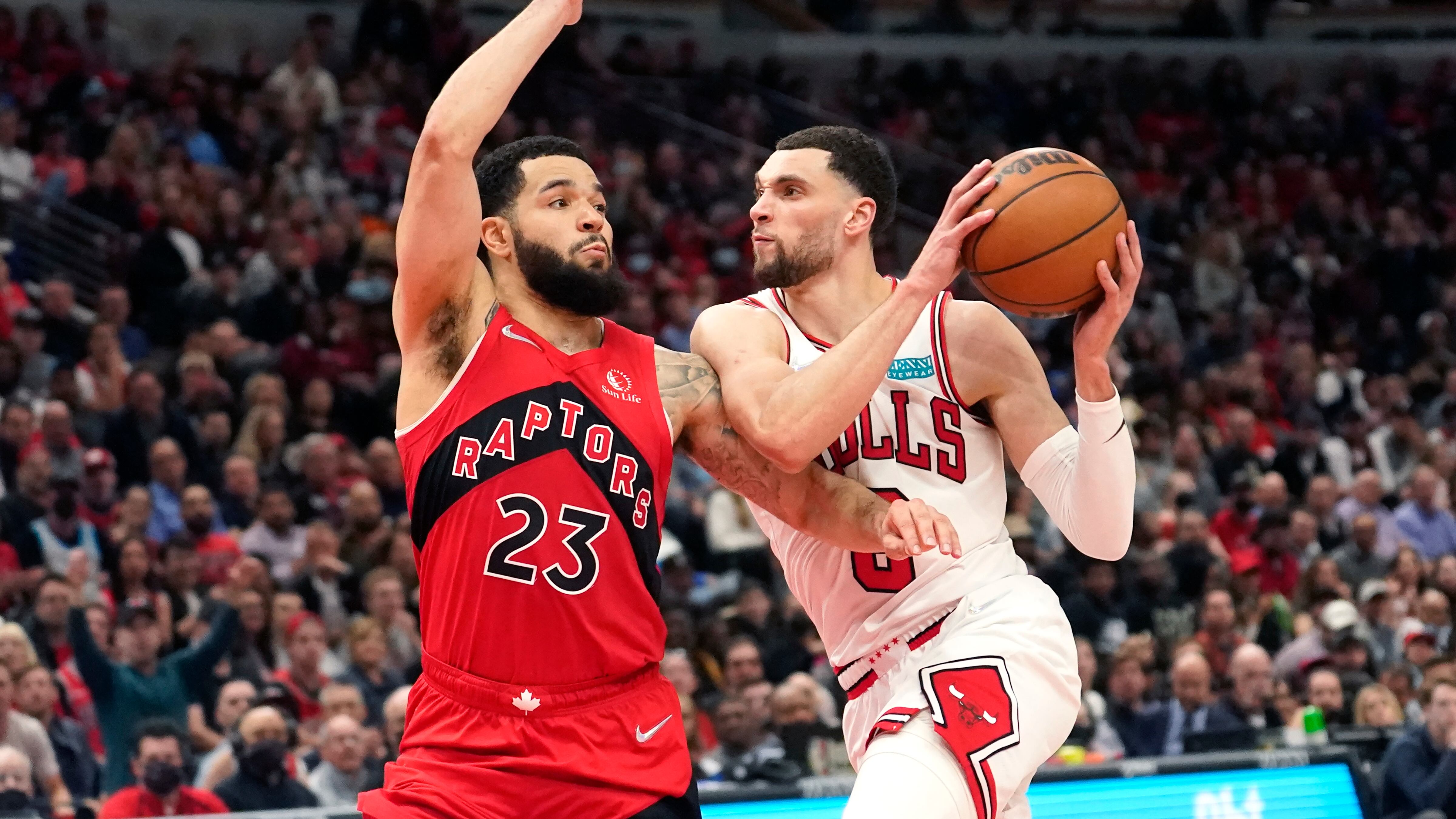 Toronto estuvo cerca hasta que LaVine anotó ocho puntos seguidos para romper el partido al tercer cuarto, cuando los Bulls tuvieron una carrera de 21-8.