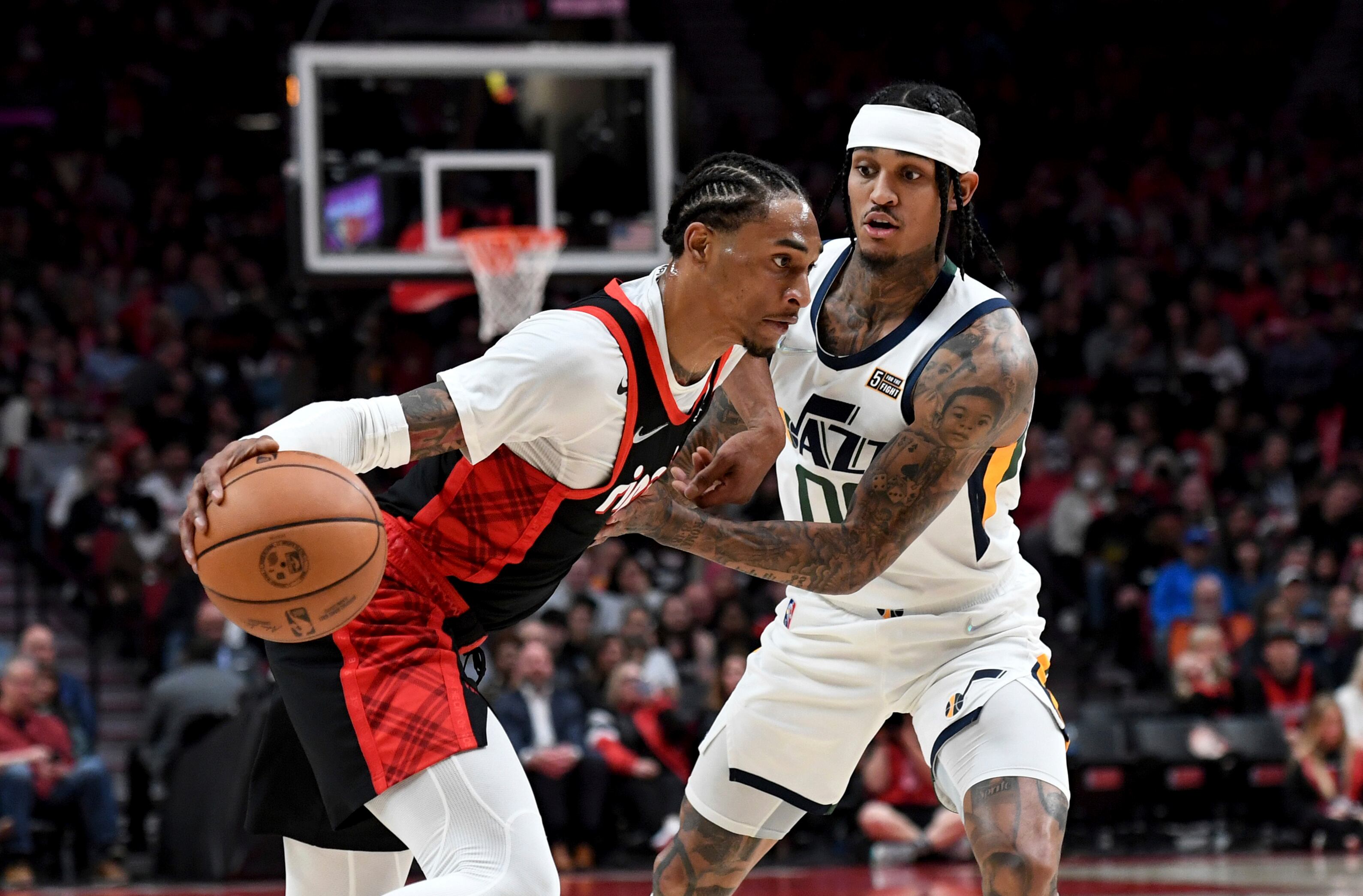 El jugador de los Trail Blazers de Portland Keon Johnson, a la izquierda, se dirige a canasta mientras Jordan Clarkson, a la derecha, del Jazz de Utah, trata de impedirlo, en la primera mitad de su juego de NBA en Portland, Oregon, el domingo 10 de abril (Steve Dykes/AP)