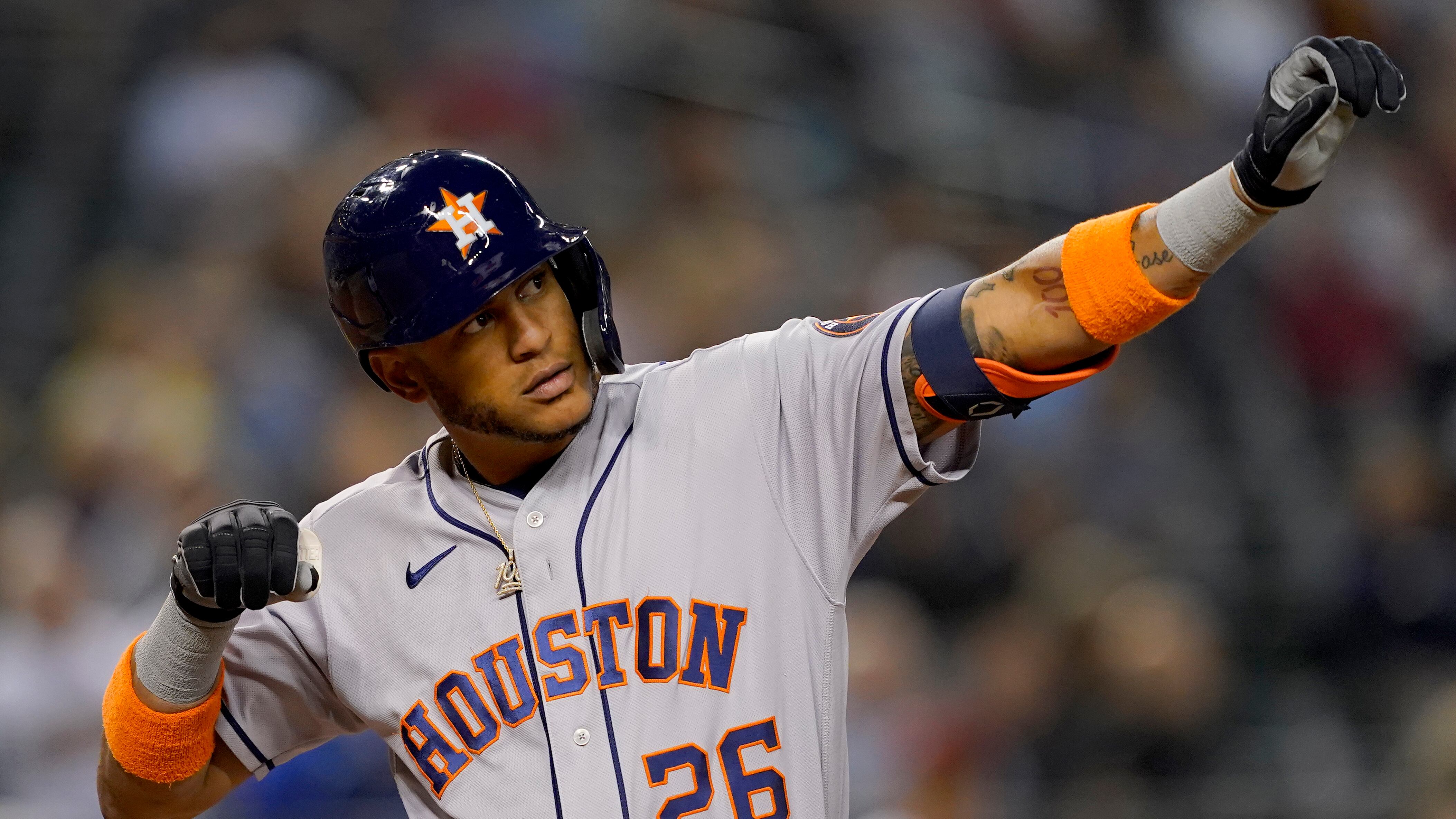 José Siri, de los Astros de Houston, llega a plato tras sacudir un jonrón solitario en el quinto inning del juego de la MLB que enfrentó a su equipo con los Diamondbacks de Arizona, el 12 de abril de 2022, en Phoenix. (AP Foto/Matt York) (Matt York/AP)