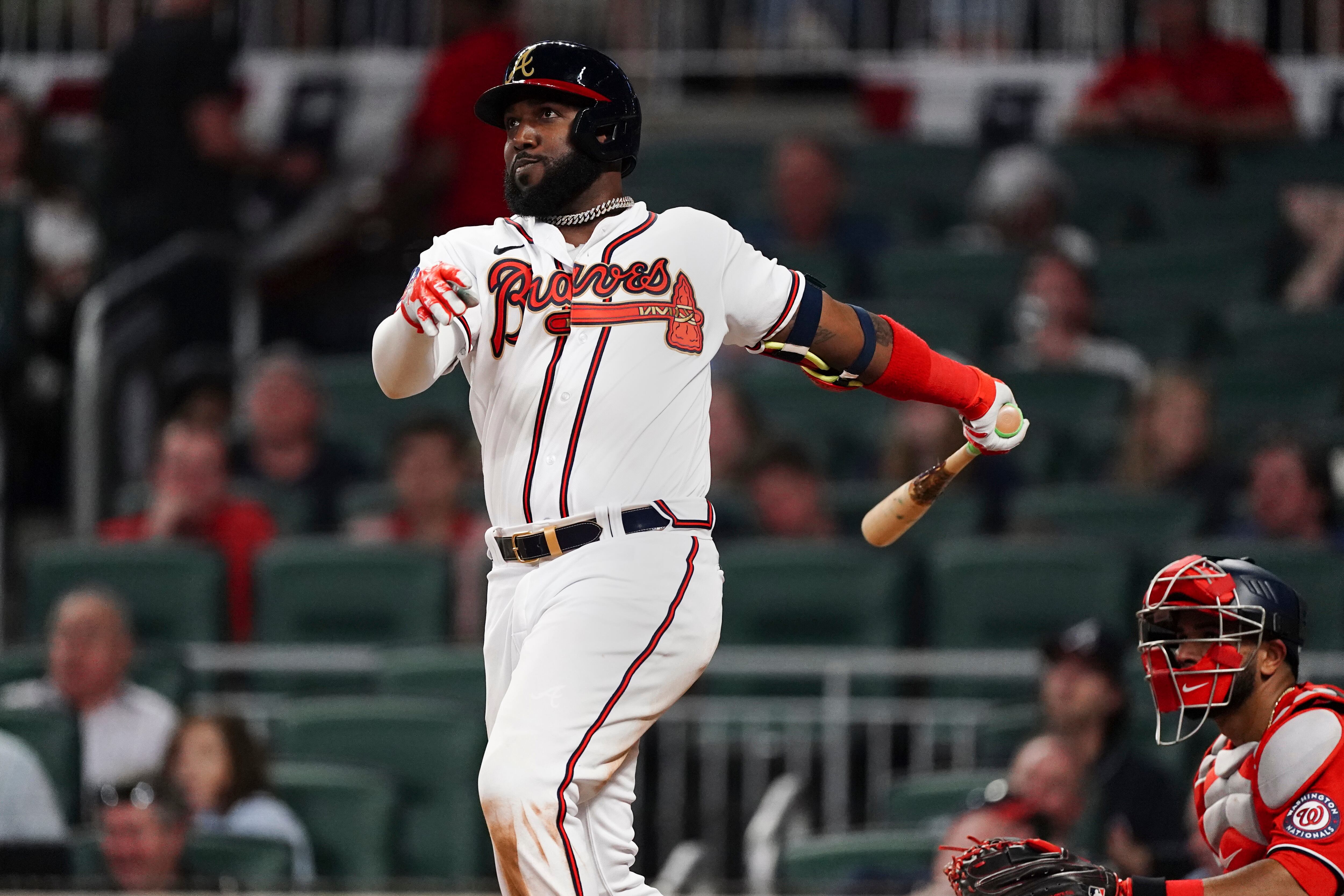 El dominicano Marcell Ozuna conecta un jonrón solitario en el quinto inning del juego ante los Nacionales de Washington, el martes 12 de abril de 2022 (AP Foto/John Bazemore) (John Bazemore/AP)