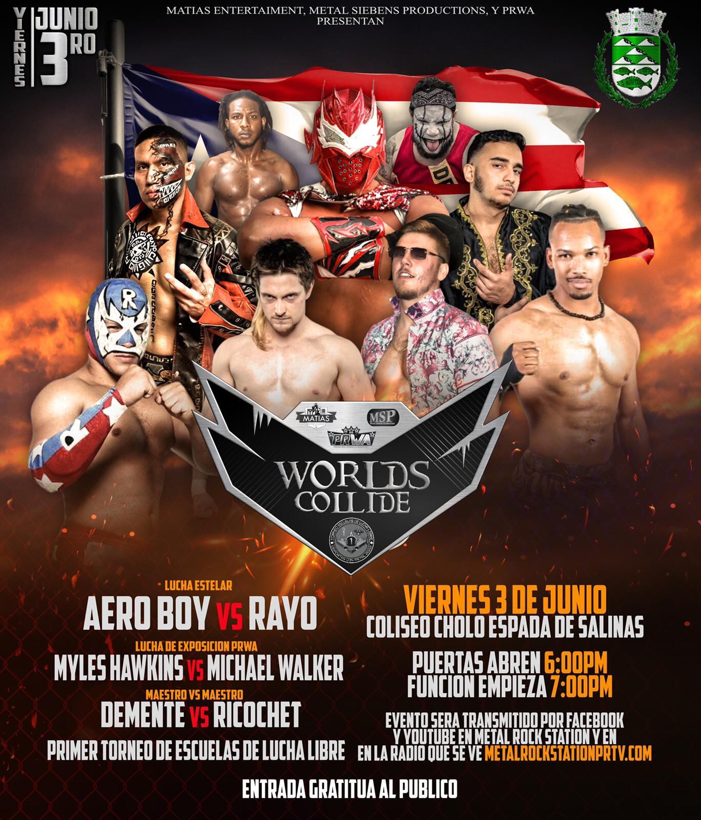 Metal Siebens Promotions, Puerto Rico Wrestling Association (PRWA) y Matias Entertainment presentan el Primer Torneo de Escuelas de Lucha Libre y el evento: Worlds Collide, el viernes 3 de junio, en el coliseo Ángel Luis “Cholo” Espada de Salinas, a partir de las 7:00 de la noche.