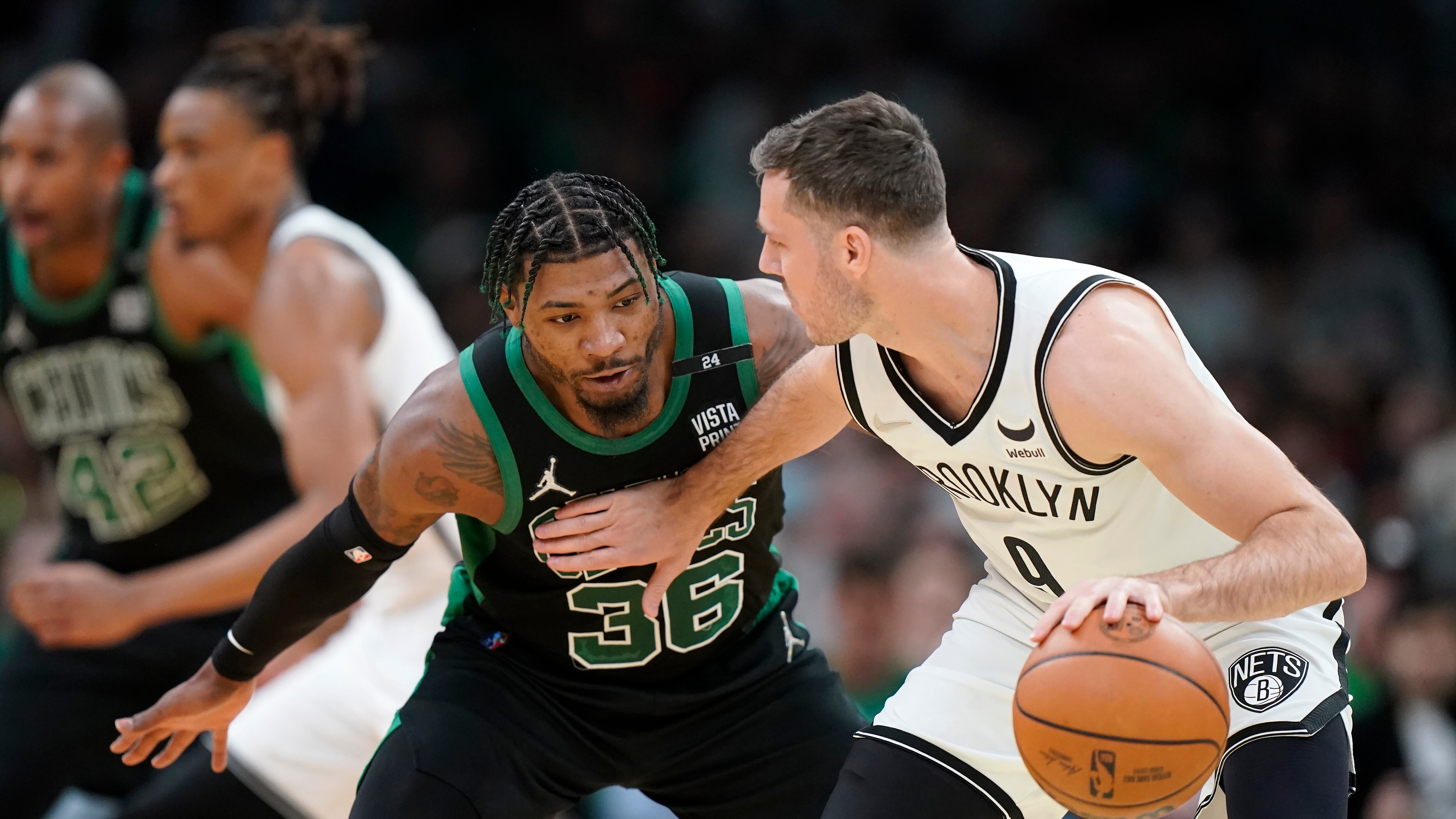 Marcus Smart (36), base de los Celtics de Boston, defiende a Goran Dragic, de Eslovenia, de los Nets de Brooklyn, en la primera mitad del juego 1 de la serie de playoffs de la Conferencia Este de la NBA, el domingo 17 de abril de 2022, en Boston. Los Celt (Steven Senne/AP)