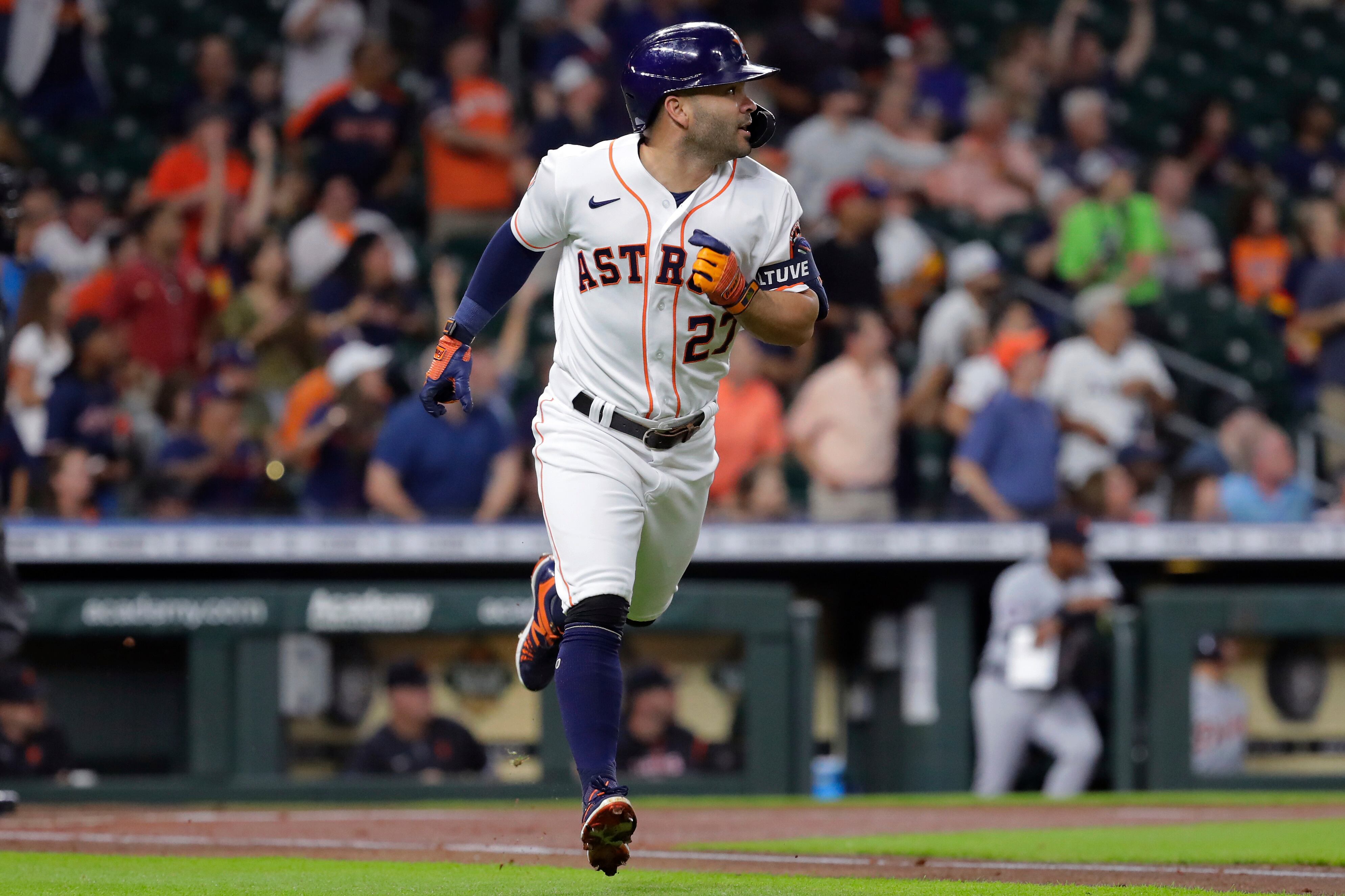 El venezolano José Altuve, de los Asros de Houston, emprende la carrera tras conectar un jonrón en la primera entrada de partido contra los Tigres de Detroit, en Houston, el jueves 5 de mayo de 2022. (AP Foto/Michael Wyke) (Michael Wyke/AP)