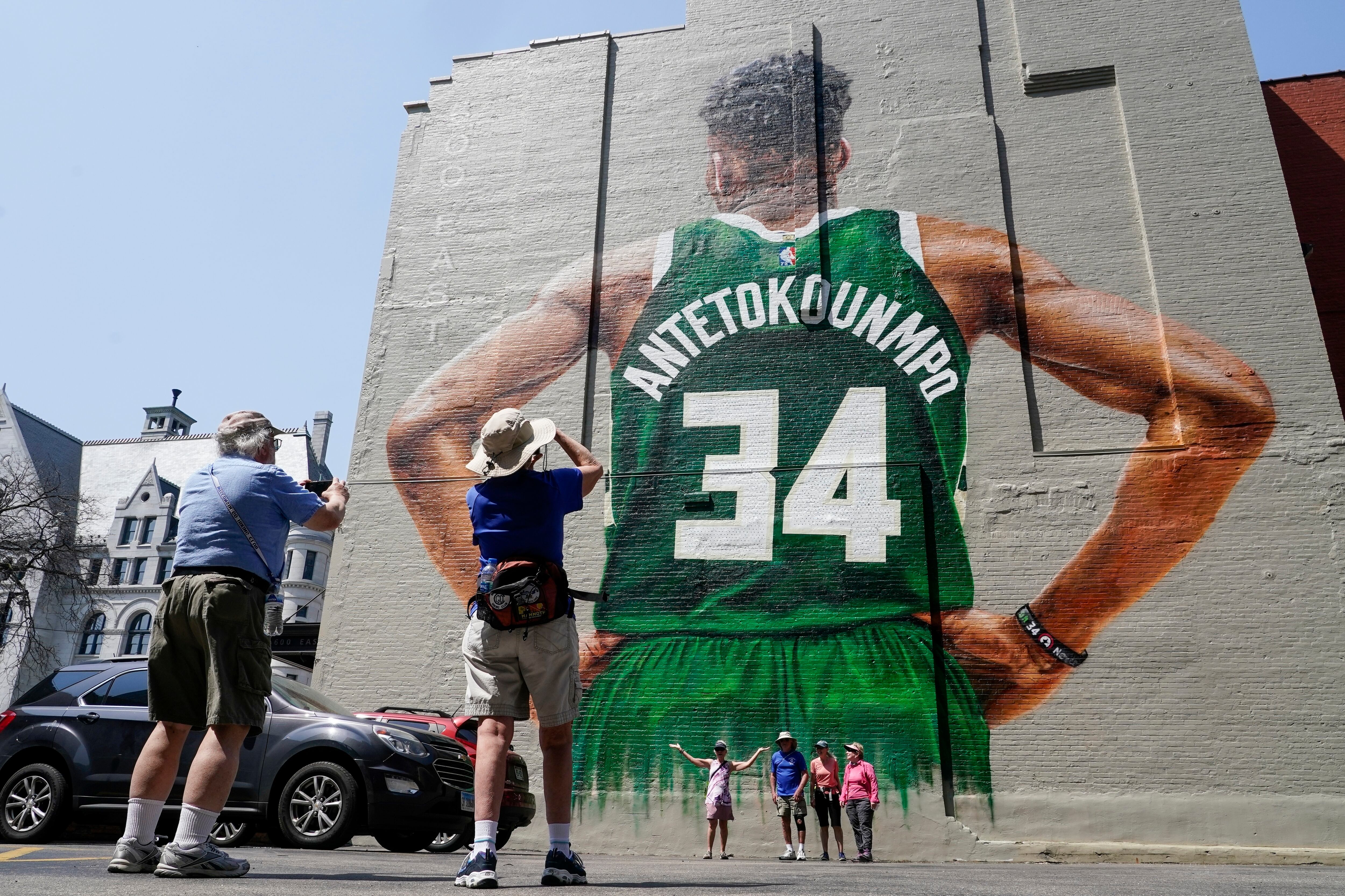 El autor del mural, Mauricio Ramírez, firmó su obra el viernes, varias horas antes de que Antetokounmpo y los Bucks enfrentaran a los Celtics de Boston en el sexto partido de la semifinal de la Conferencia Este.