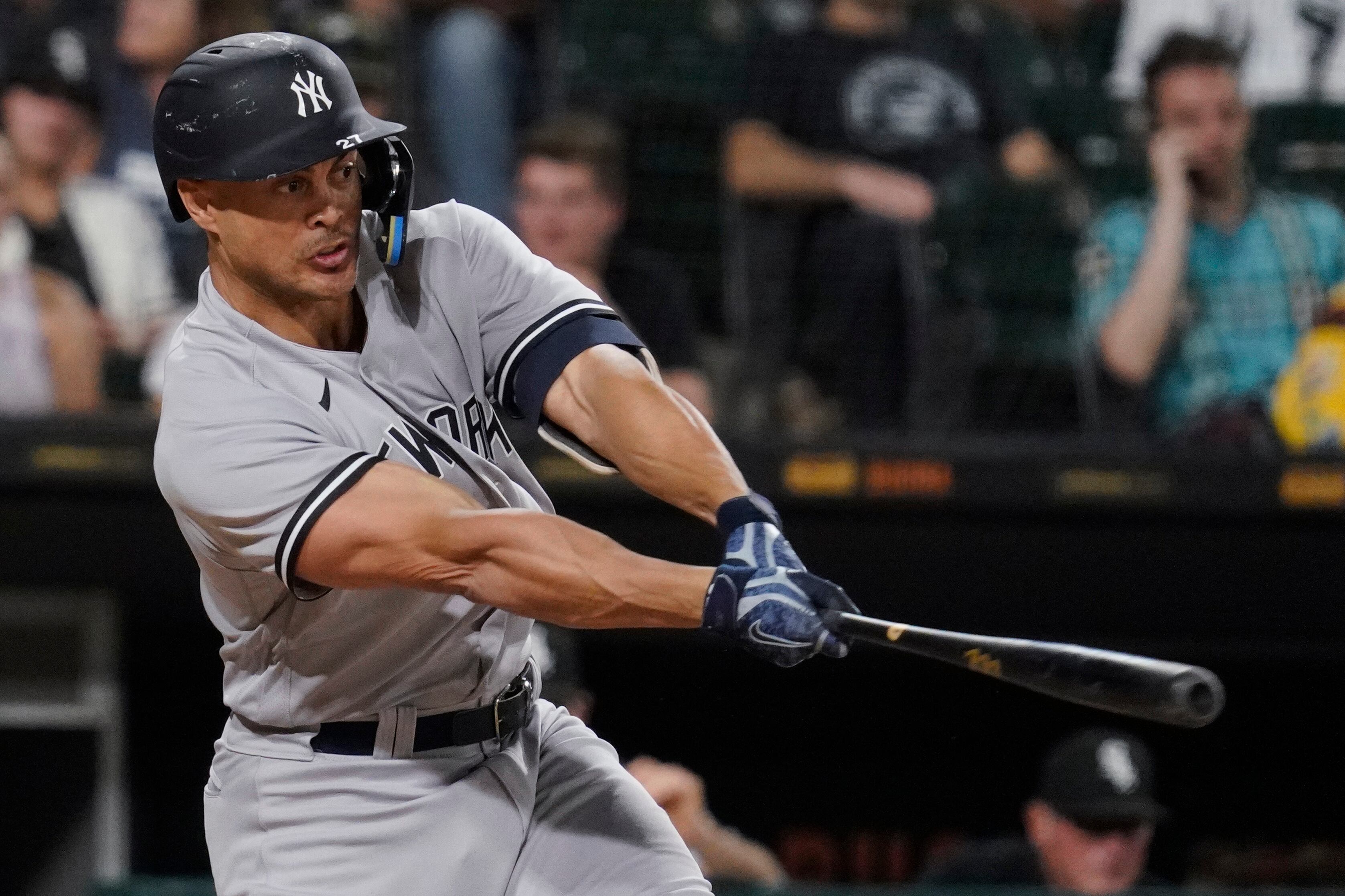 Giancarlo Stanton, de los Yanquis de Nueva York, conecta un sencillo de dos carreras en el encuentro del jueves 12 de mayo de 2022, ante los Medias Blancas de Chicago (AP Foto/Nam Y. Huh) (Nam Y. Huh/AP)