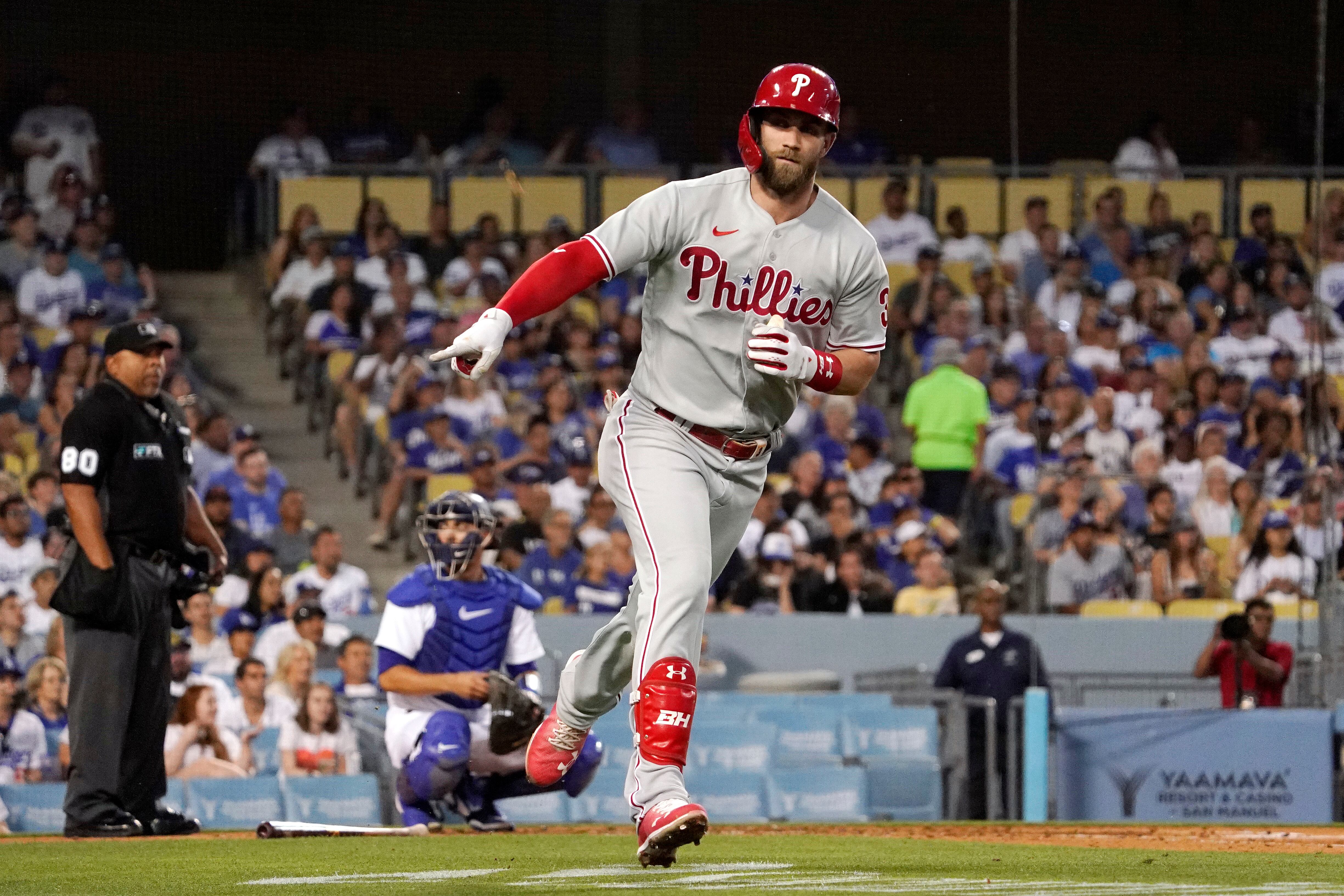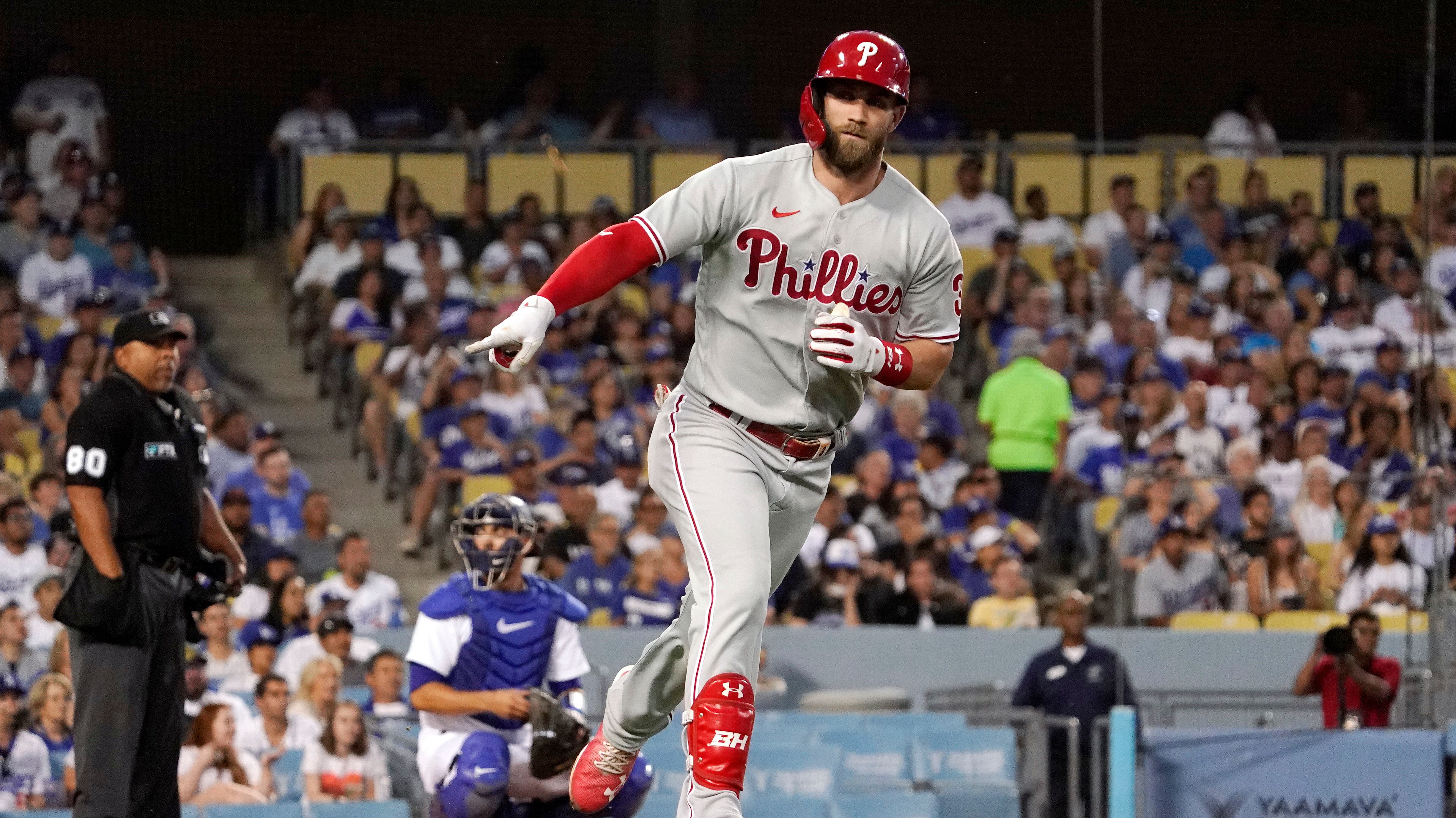 LOS ÁNGELES (AP) — Bryce Harper jonroneó en el Dodger Stadium por tercer juego en fila y terminó con tres hits, y los Filis de Filadelfia sumaron cuatro cuadrangulares en una victoria 8-3 el sábado sobre los renqueantes Dodgers de Los Ángeles.