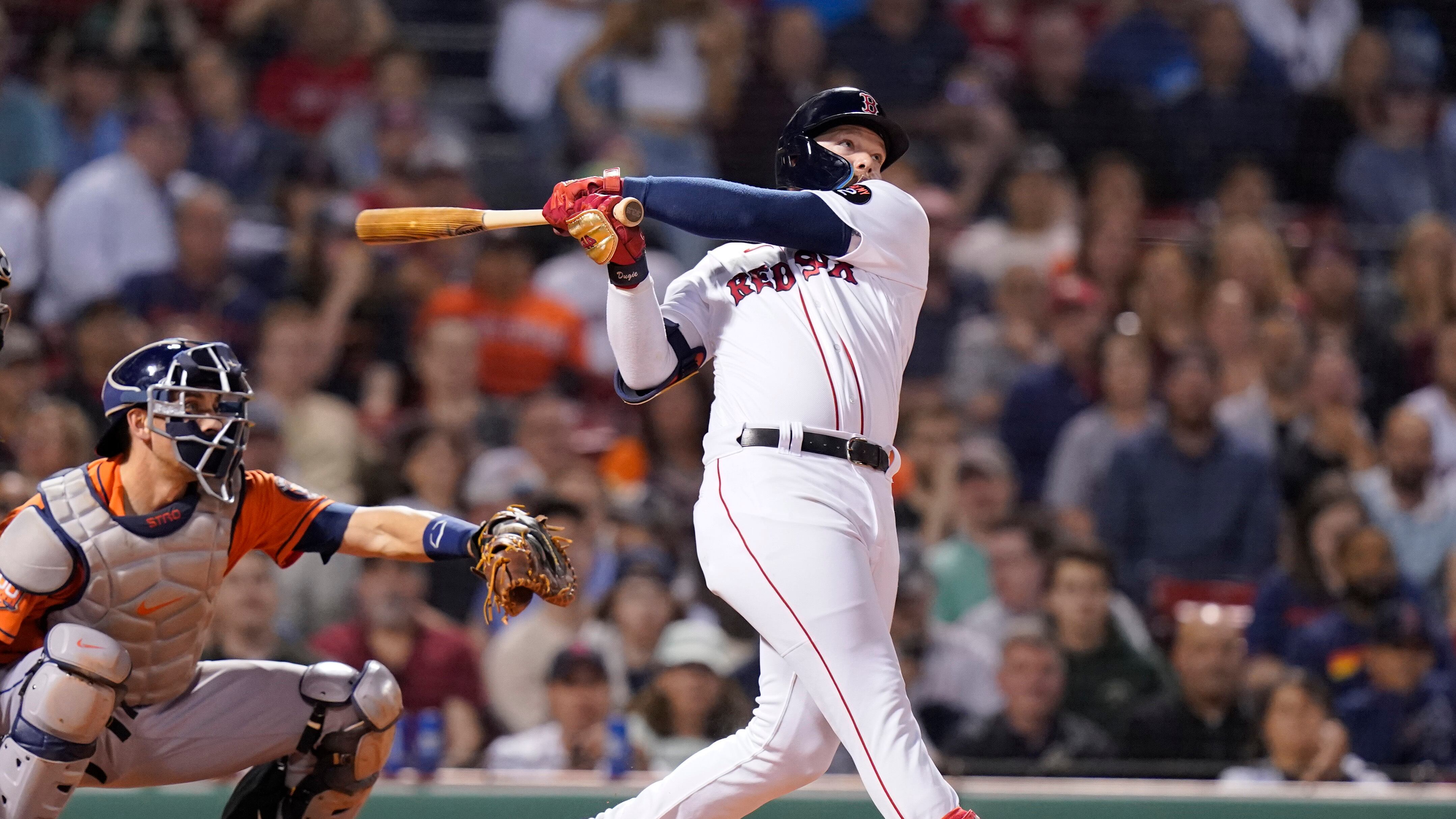 El jugador de los Medias Rojas de Boston Alex Verdugo batea en una jugada de escogencia que permitió anotar a su compañero Kiké Hernández, junto al jugador de los Astros de Houston Jason Castro, en el cuarto inning de su juego de béisbol, el 16 de ma (Steven Senne/AP)