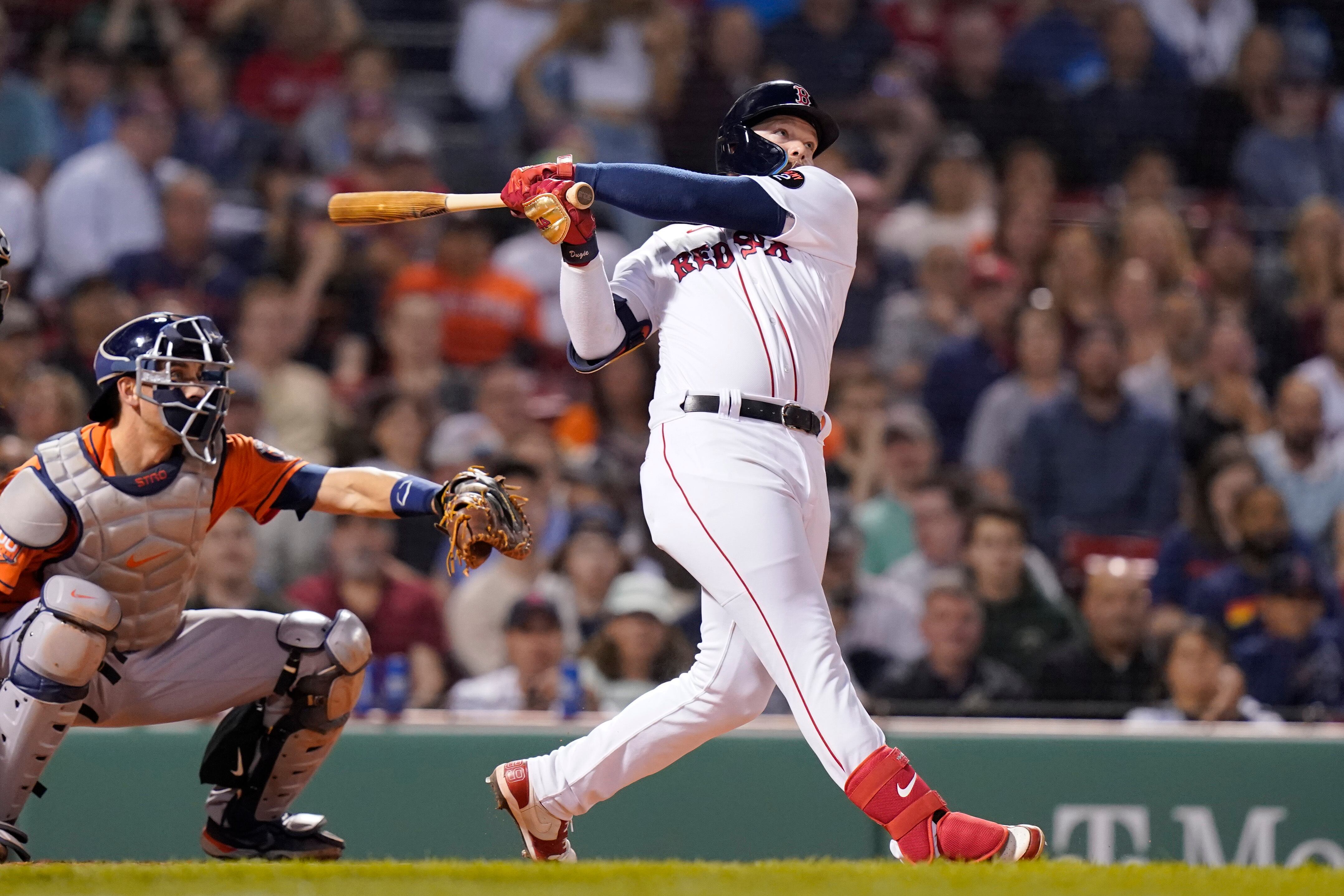 El jugador de los Medias Rojas de Boston Alex Verdugo batea en una jugada de escogencia que permitió anotar a su compañero Kiké Hernández, junto al jugador de los Astros de Houston Jason Castro, en el cuarto inning de su juego de béisbol, el 16 de ma (Steven Senne/AP)