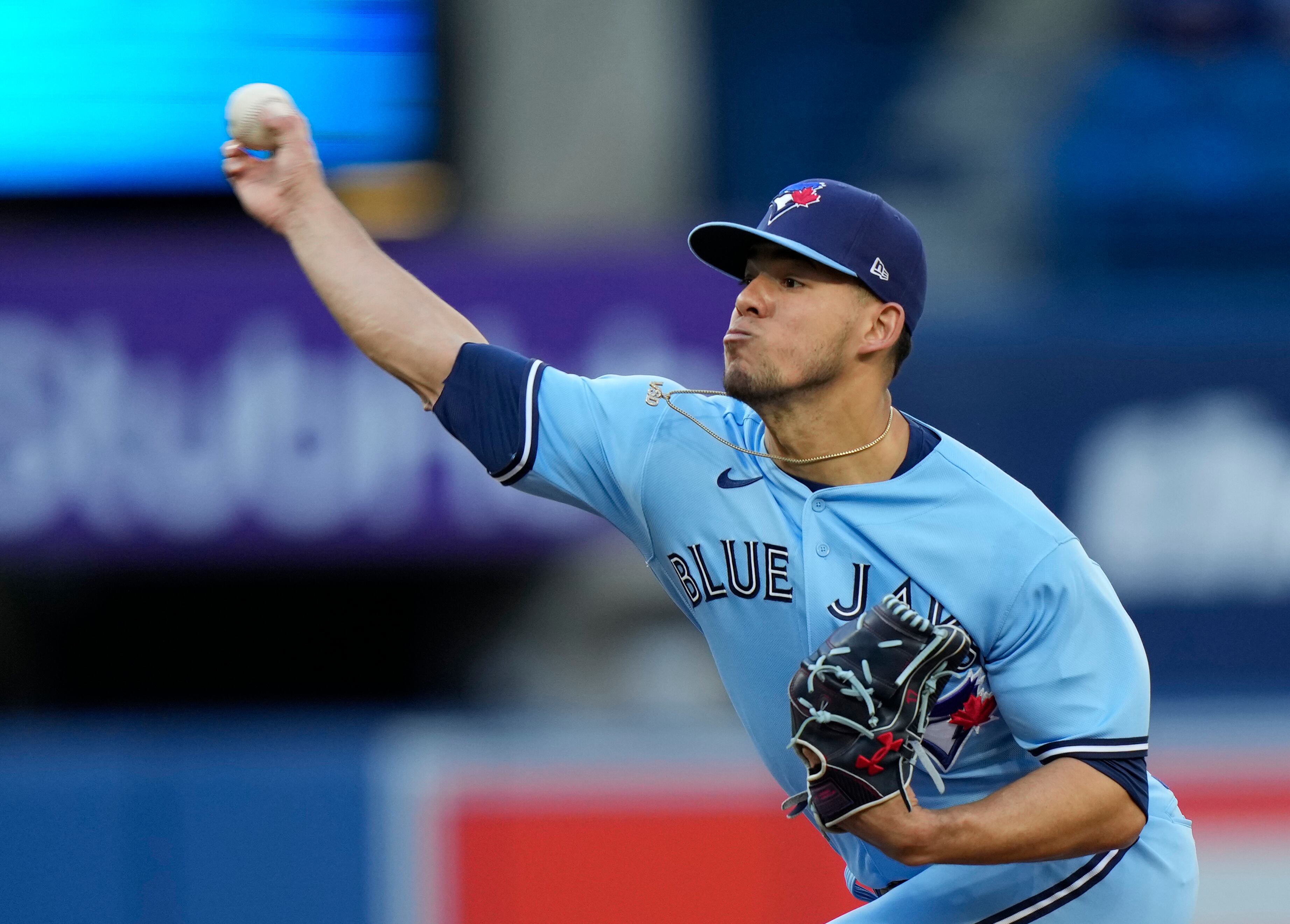 El puertorriqueño José Berríos, de los Azulejos de Toronto, hace un lanzamiento en el duelo ante los Marineros de Seattle, el martes 17 de mayo de 2022 (Frank Gunn/The Canadian Press via AP) (Frank Gunn/AP)