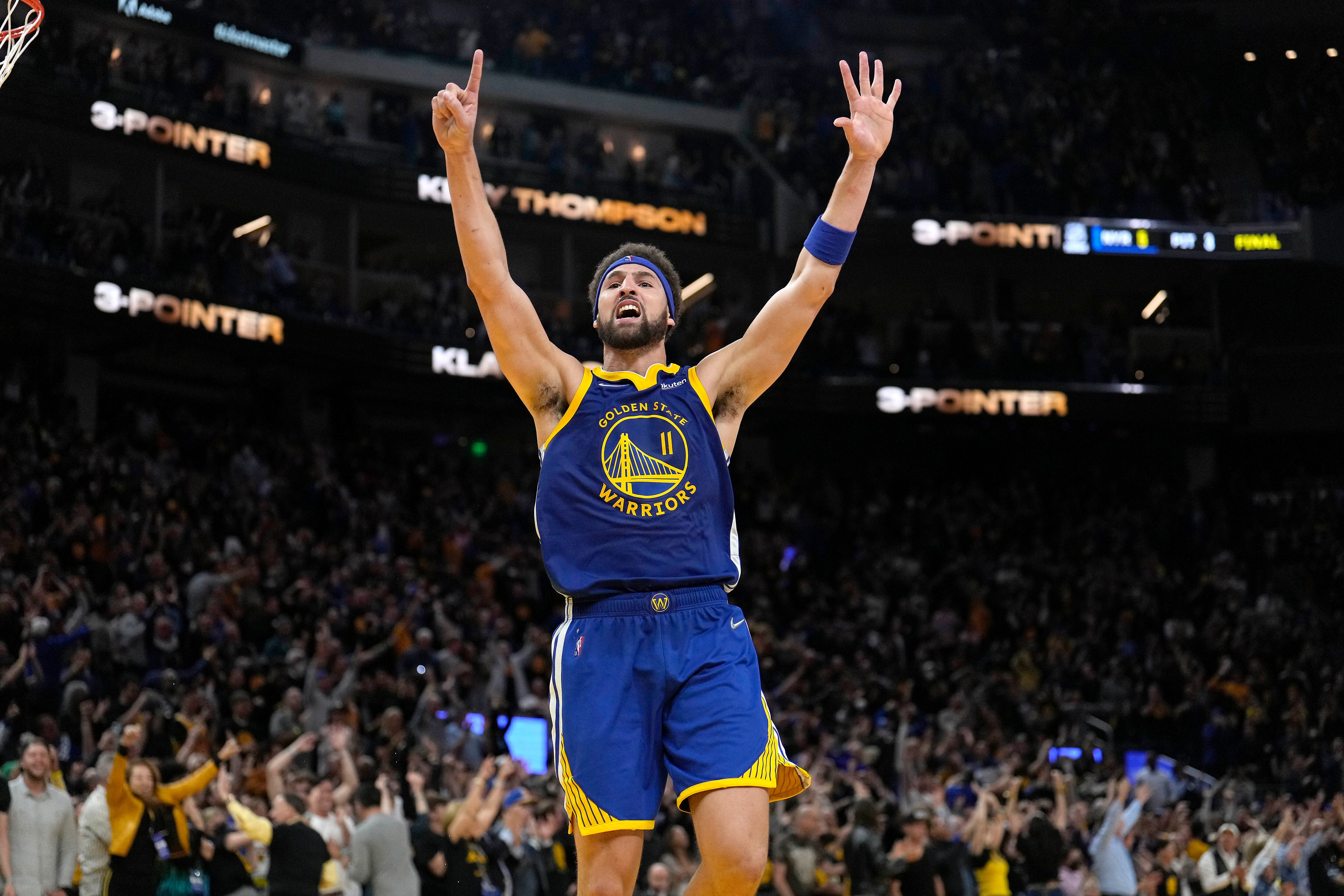 En foto del viernes 13 de mayo del 2022, el base de los Warriors de Golden State Klay Thompson celebra su triple en el encuentro ante los Grizzlies de Memphis en las semifinales de la Conferencia Oeste. El martes 17 de mayo del 2022, los Warriors están l (Tony Avelar/AP)
