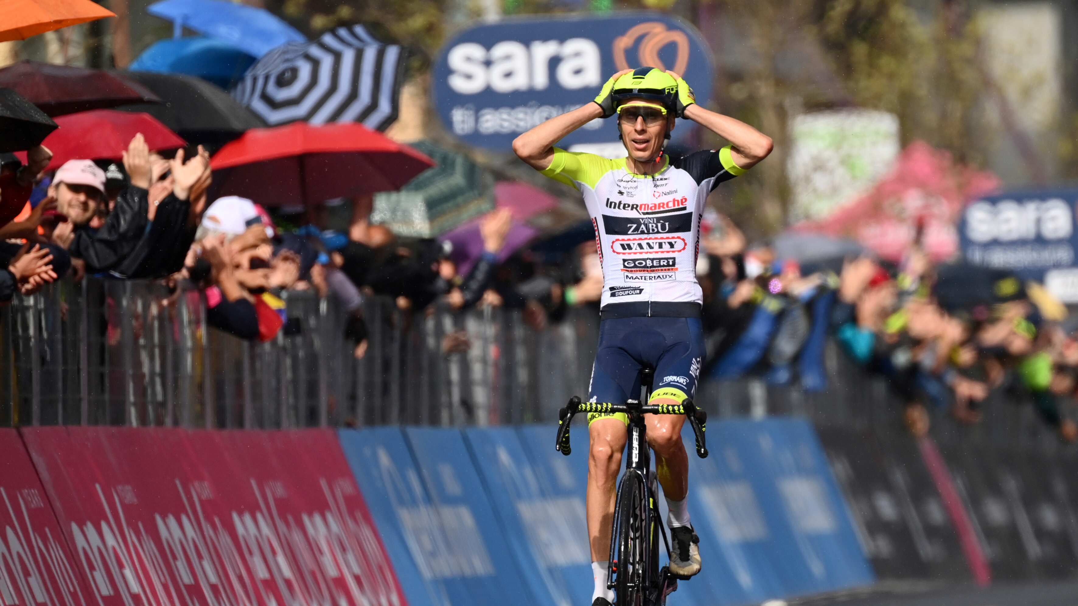 Hirt se tomó la cabeza con incredulidad antes de levantar las manos al cruzar al meta al final de la ruta de 202 kilómetros entre Salo y Aprica, que incluyó uno de los ascensos más complicados del deporte en Mortirolo.