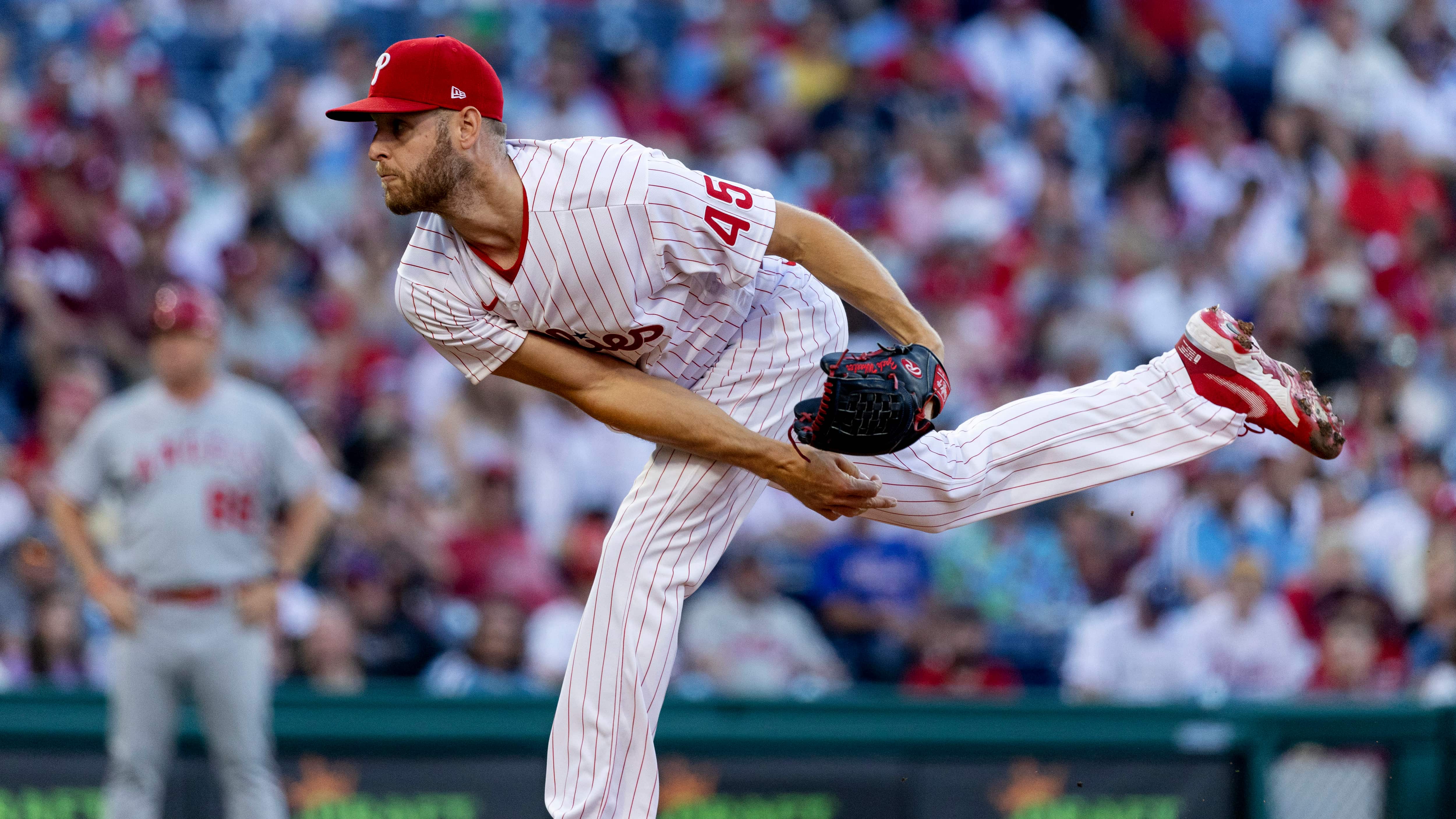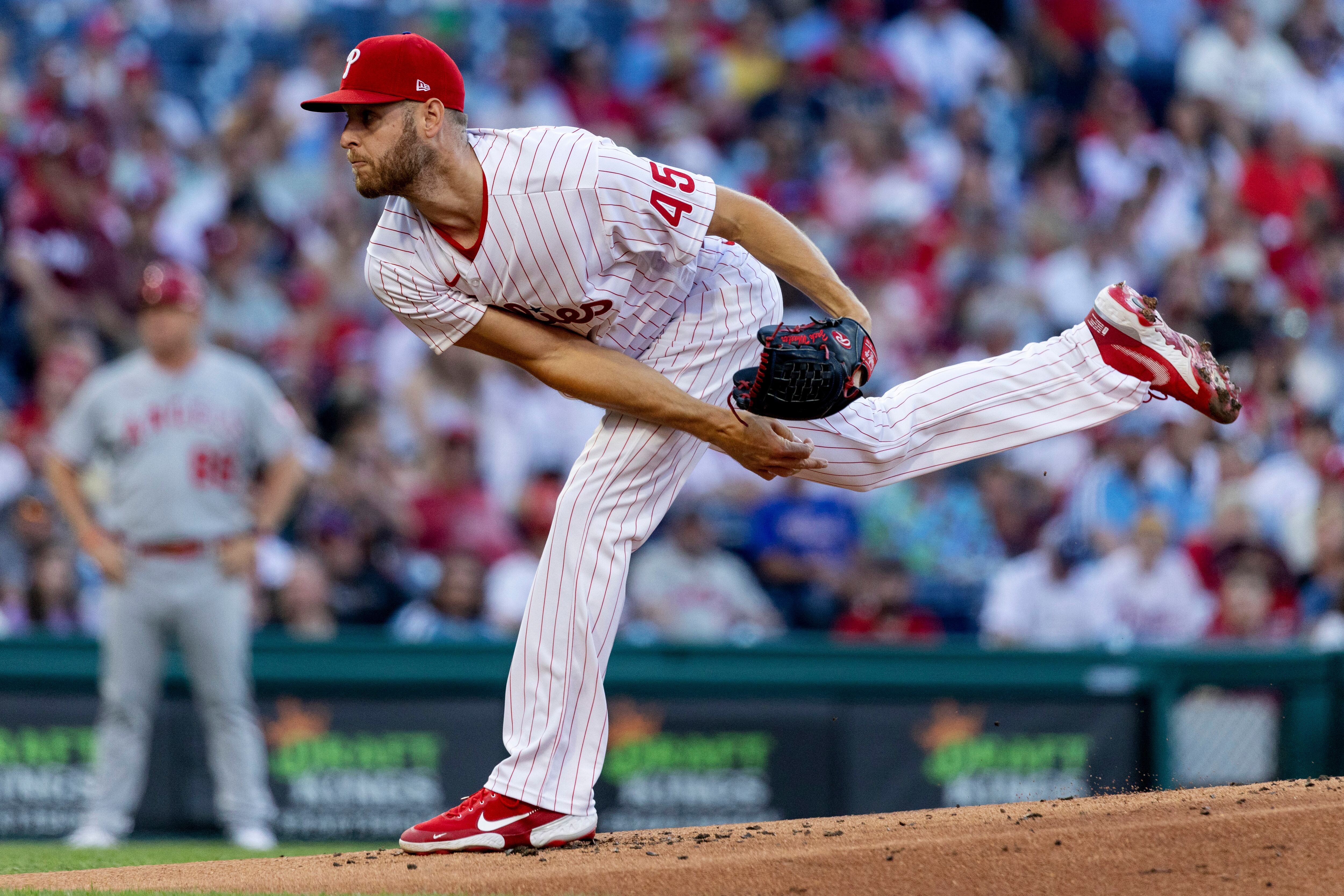 Zach Wheeler, abridor de los Filis de Filadelfia, hace un lanzamiento en el duelo del sábado 4 de junio de 2022, ante los Angelinos de Los Ángeles (AP Foto/Laurence Kesterson) AP (Laurence Kesterson/AP)