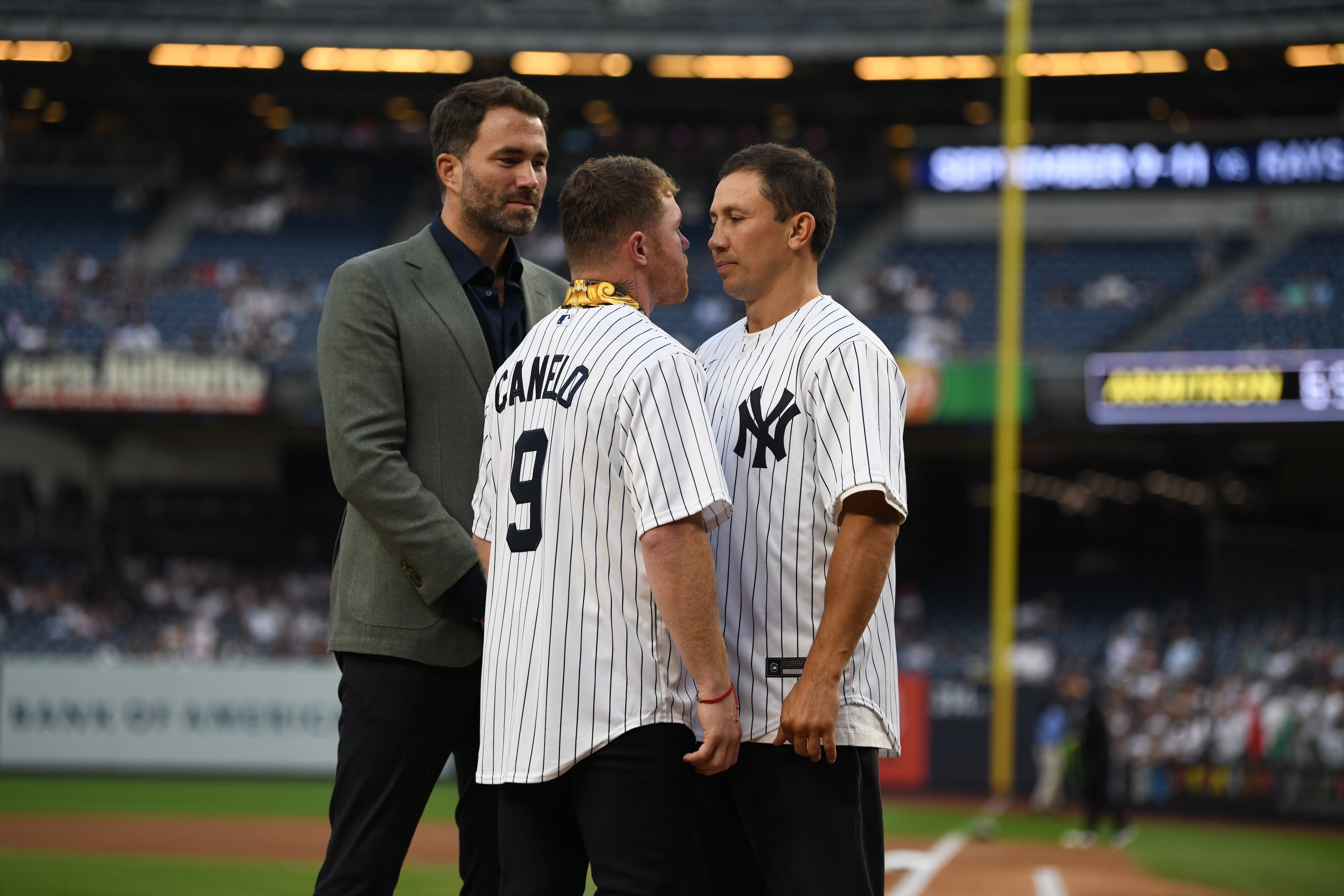 Uno de los combates que más se esperarán en lo que resta del año será el tercer episodio entre Saúl “Canelo” Álvarez y Gennady Golovkin, la cual se realizará el próximo 17 de septiembre en el T-Mobile Arena de Las Vegas. Ambos pugilistas se encuentras en la promoción de la pelea y este lunes lo hicieron en Nueva York, donde además de realizar una conferencia de prensa, acudieron al Yankee Stadium para lanzar la primera bola del juego entre los Yankees y los Athletics de Oakland.