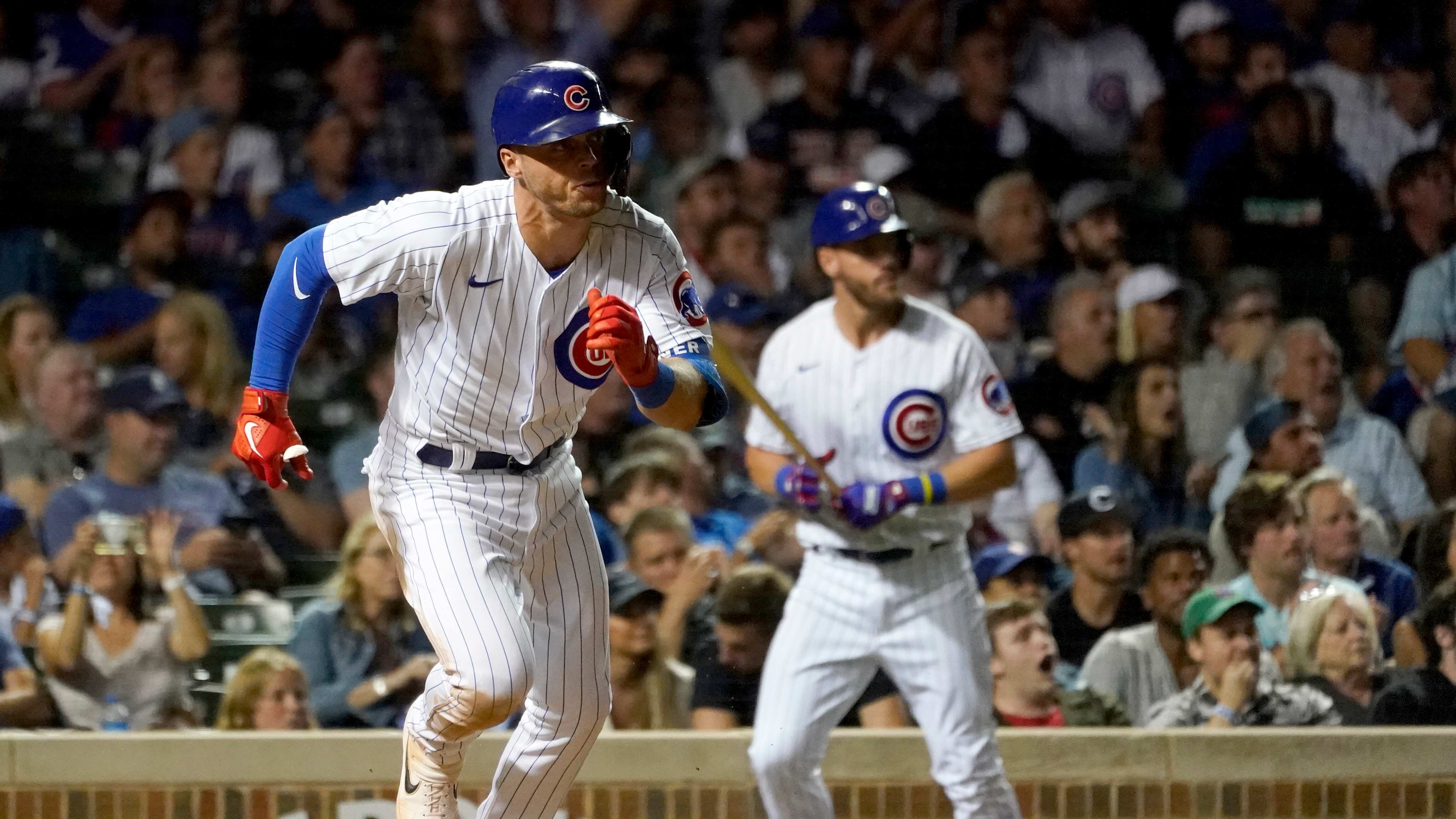 Nico Hoernet de los Cachorros de Chicago observa su doble productor ante el relevista de los Piratas de Pittsburgh Yerry de los Santos durante la octava entrada del juego de las Grandes Ligas, el lunes 25 de julio de 2022, en Chicago. (AP Foto/Charles Rex AP (Charles Rex Arbogast/AP)
