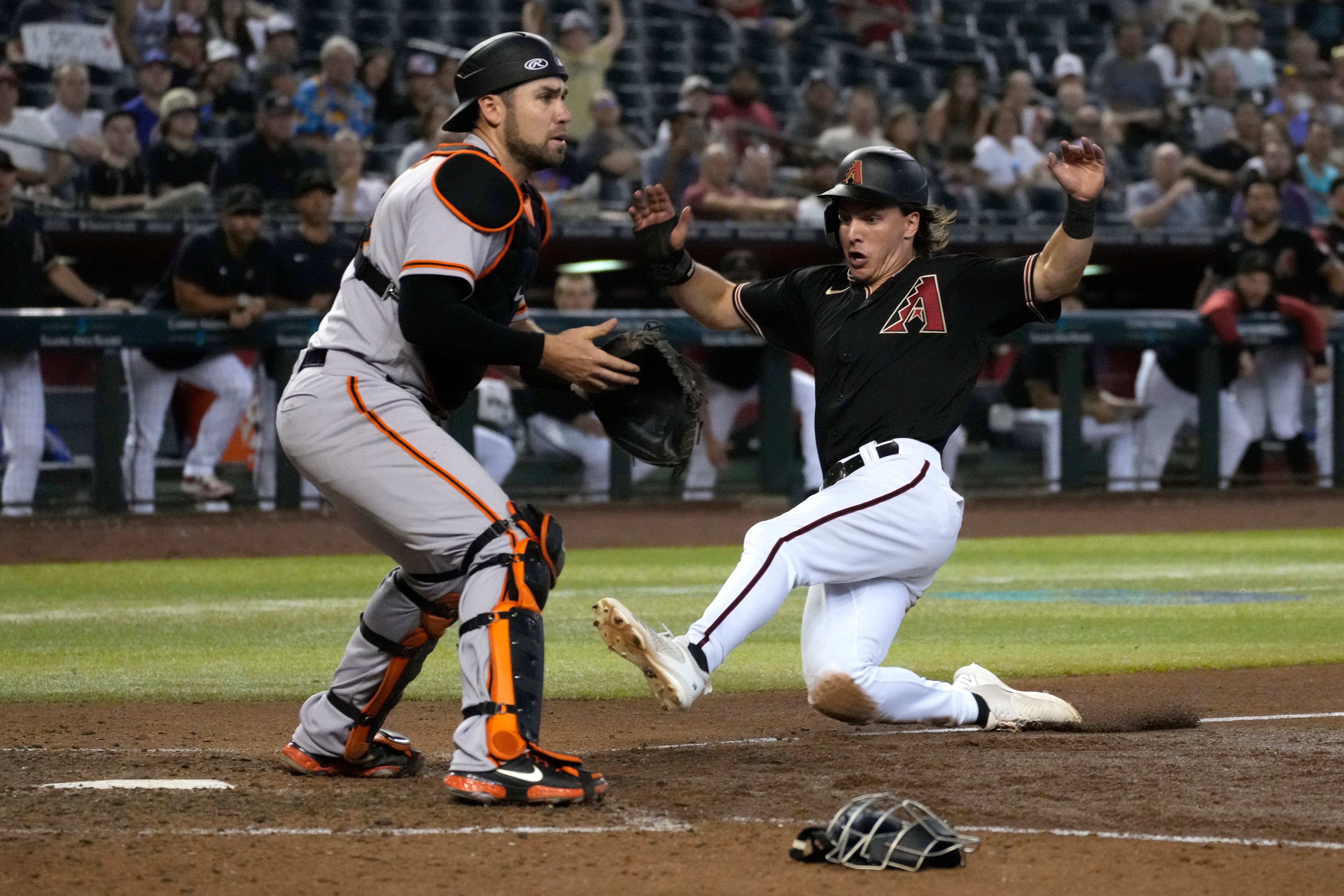 Jake McCarthy abrió la séptima entrada con un toque que fue revertido por la repetición de video, después de que se marcó out. El dominicano Sergio Alcántara pegó un sencillo frente a Logan Webb (9-4) después de haberse cuadrado para intentar el toque.