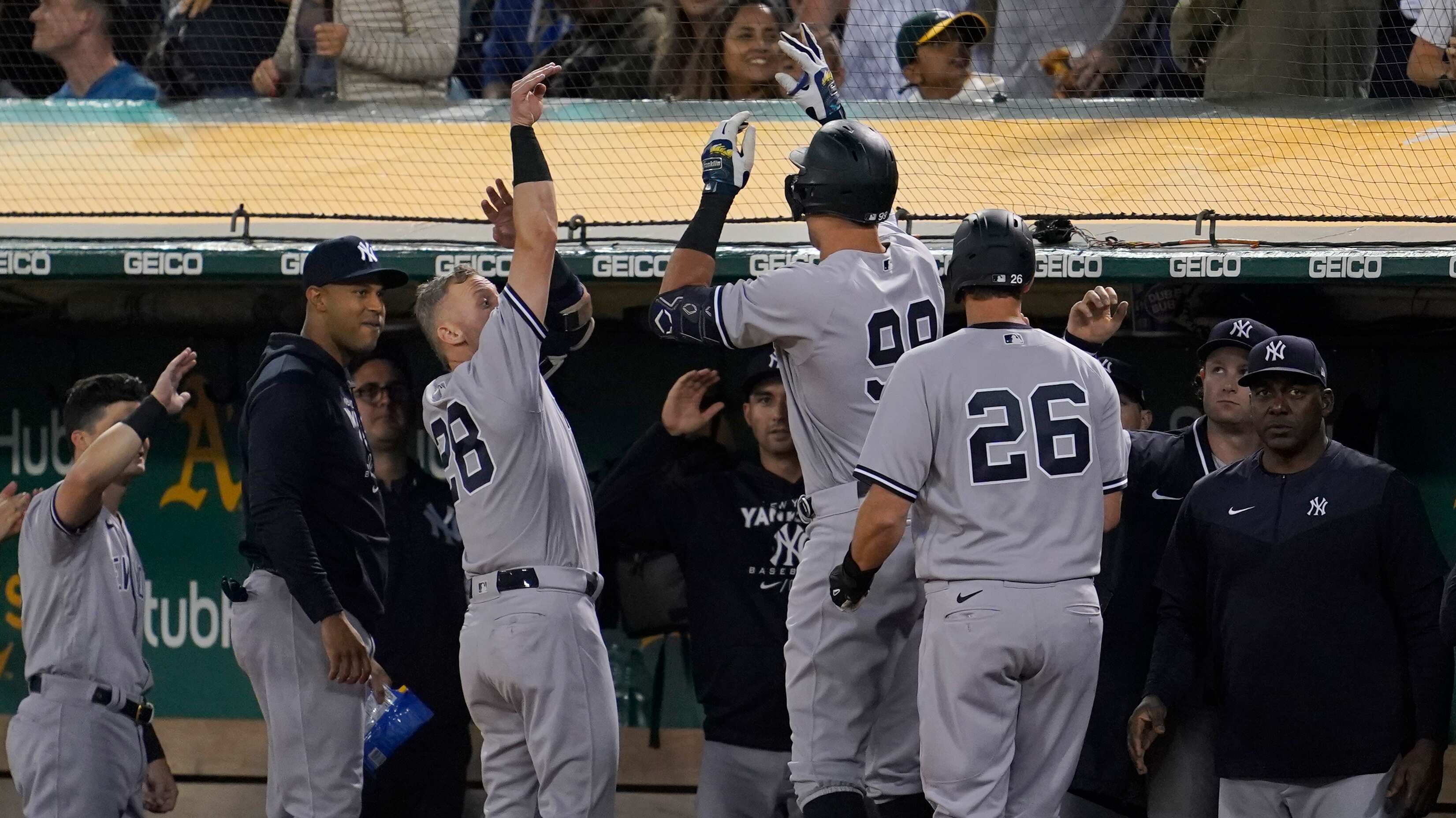 Por los Yanquis, los venezolanos Gleyber Torres de 5-1; Oswaldo Cabrera de 4-3, con una anotada.
