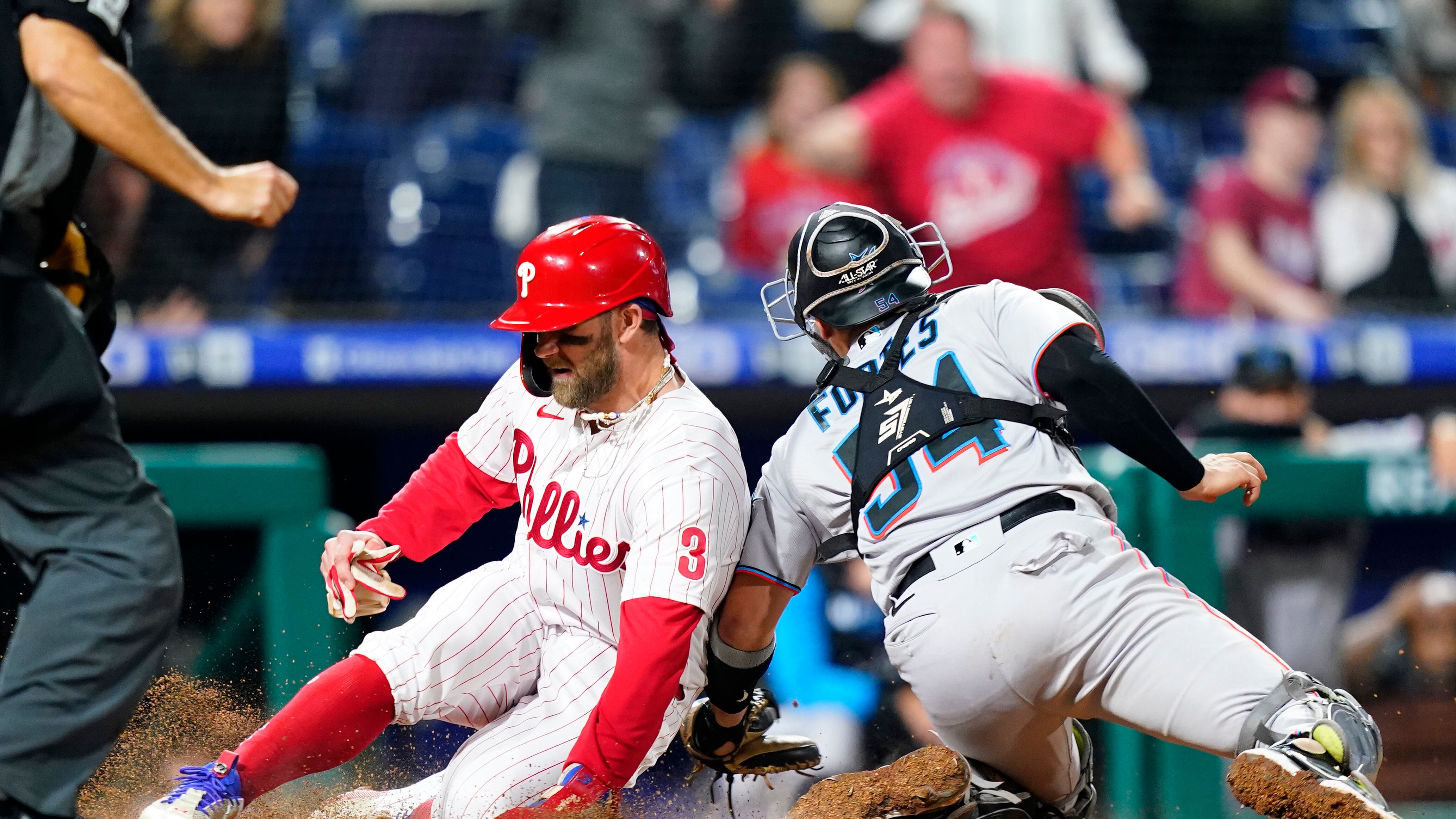 FILADELFIA (AP) — Bryce Harper consiguió un doble de regalo en el noveno episodio, cuando el jardinero izquierdo Brian Anderson se resbaló persiguiendo un elevado, antes de anotar con un sencillo del dominicano Jean Segura para que los Filis de Filadelfia superaran el martes por 3-2 a los Marlins de Miami.