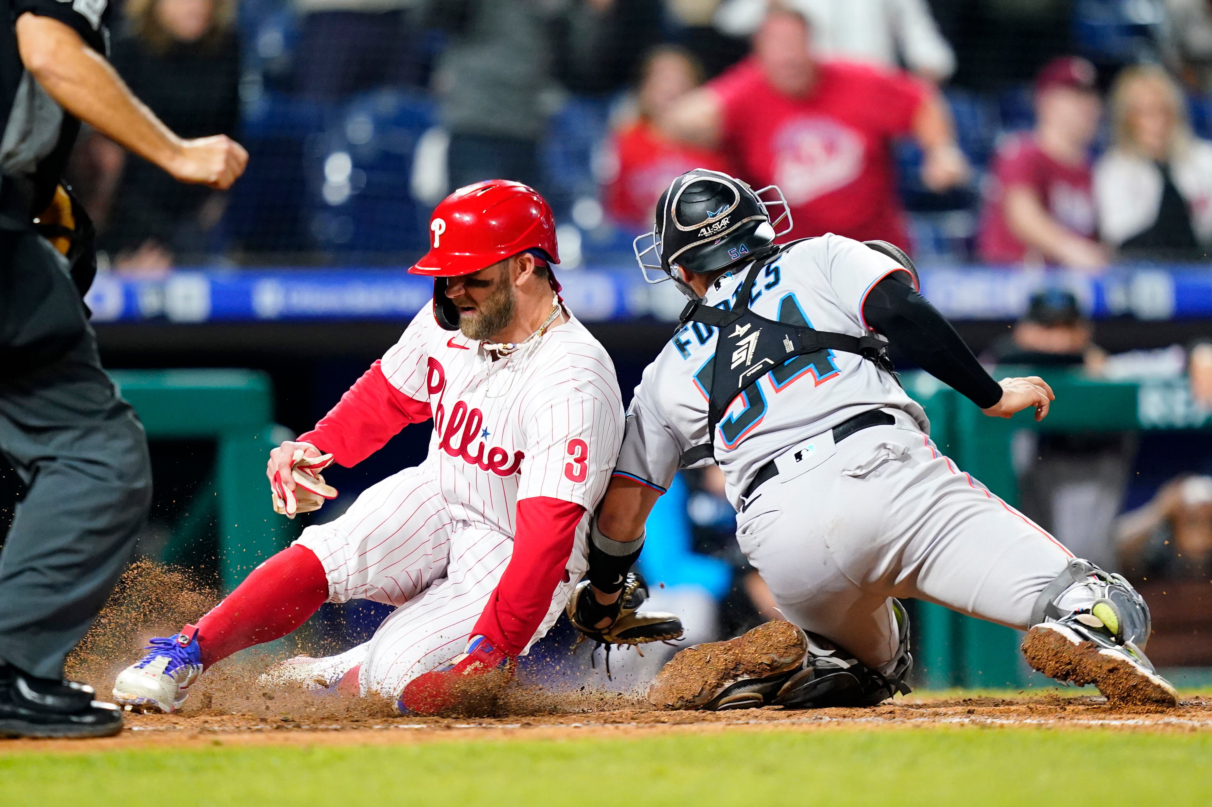 FILADELFIA (AP) — Bryce Harper consiguió un doble de regalo en el noveno episodio, cuando el jardinero izquierdo Brian Anderson se resbaló persiguiendo un elevado, antes de anotar con un sencillo del dominicano Jean Segura para que los Filis de Filadelfia superaran el martes por 3-2 a los Marlins de Miami.