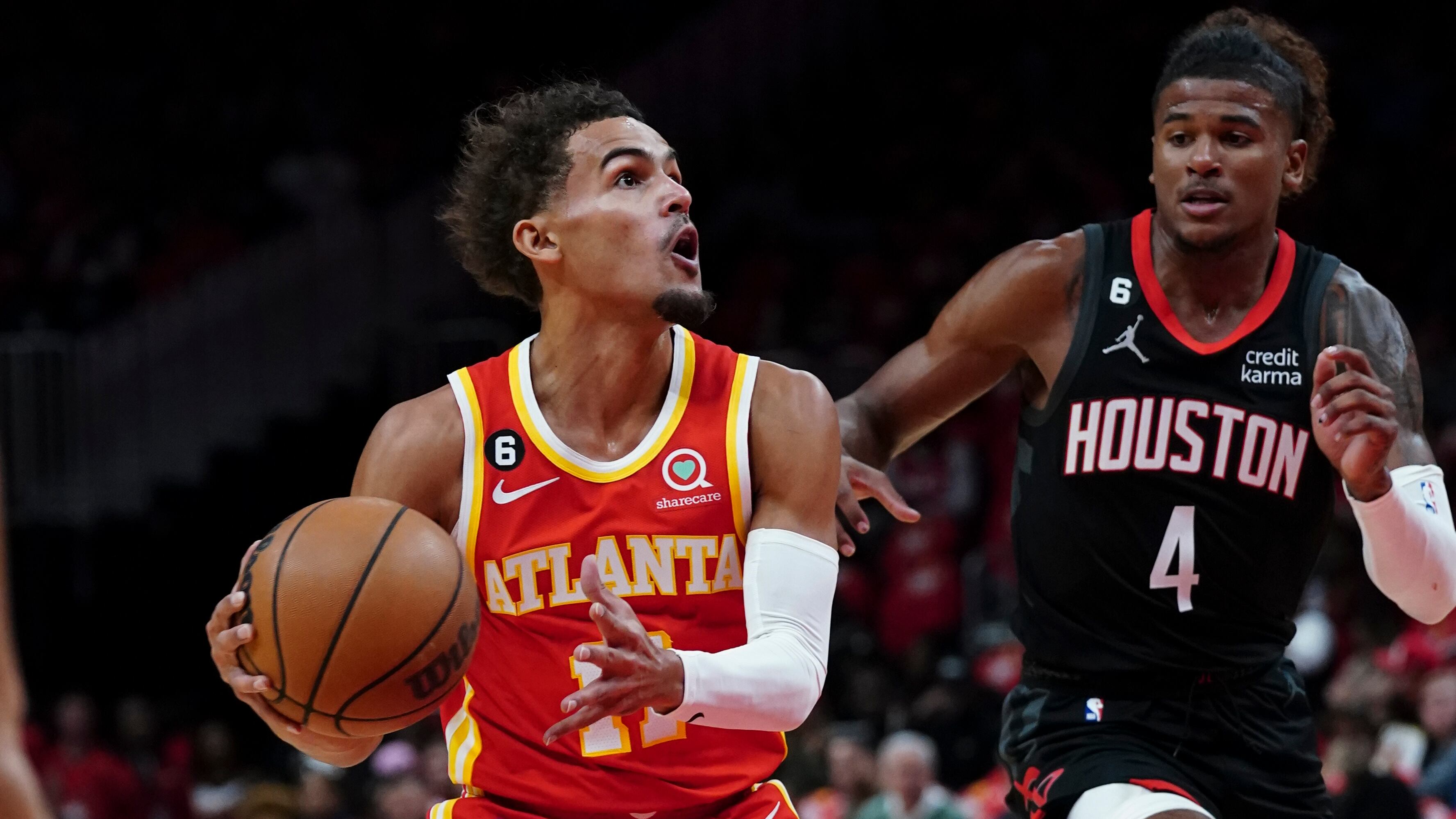 Trae Young, base de los Hawks de Atlanta, avanza hacia la cesta frente a Jalen Green, de los Rockets de Houston, en el encuentro del miércoles 19 de octubre de 2022 (AP Foto/John Bazemore) AP (John Bazemore/AP)