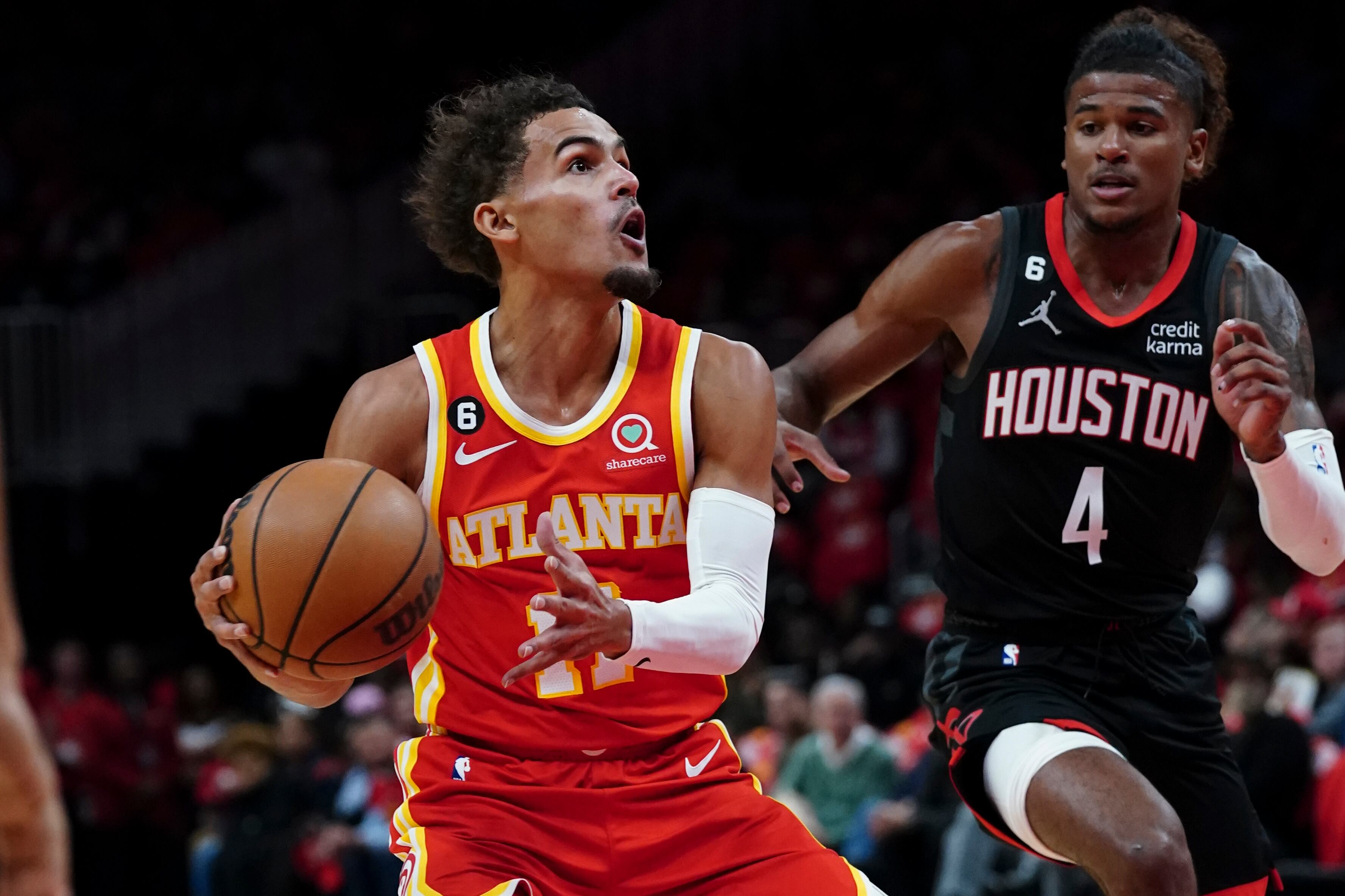 Trae Young, base de los Hawks de Atlanta, avanza hacia la cesta frente a Jalen Green, de los Rockets de Houston, en el encuentro del miércoles 19 de octubre de 2022 (AP Foto/John Bazemore) AP (John Bazemore/AP)