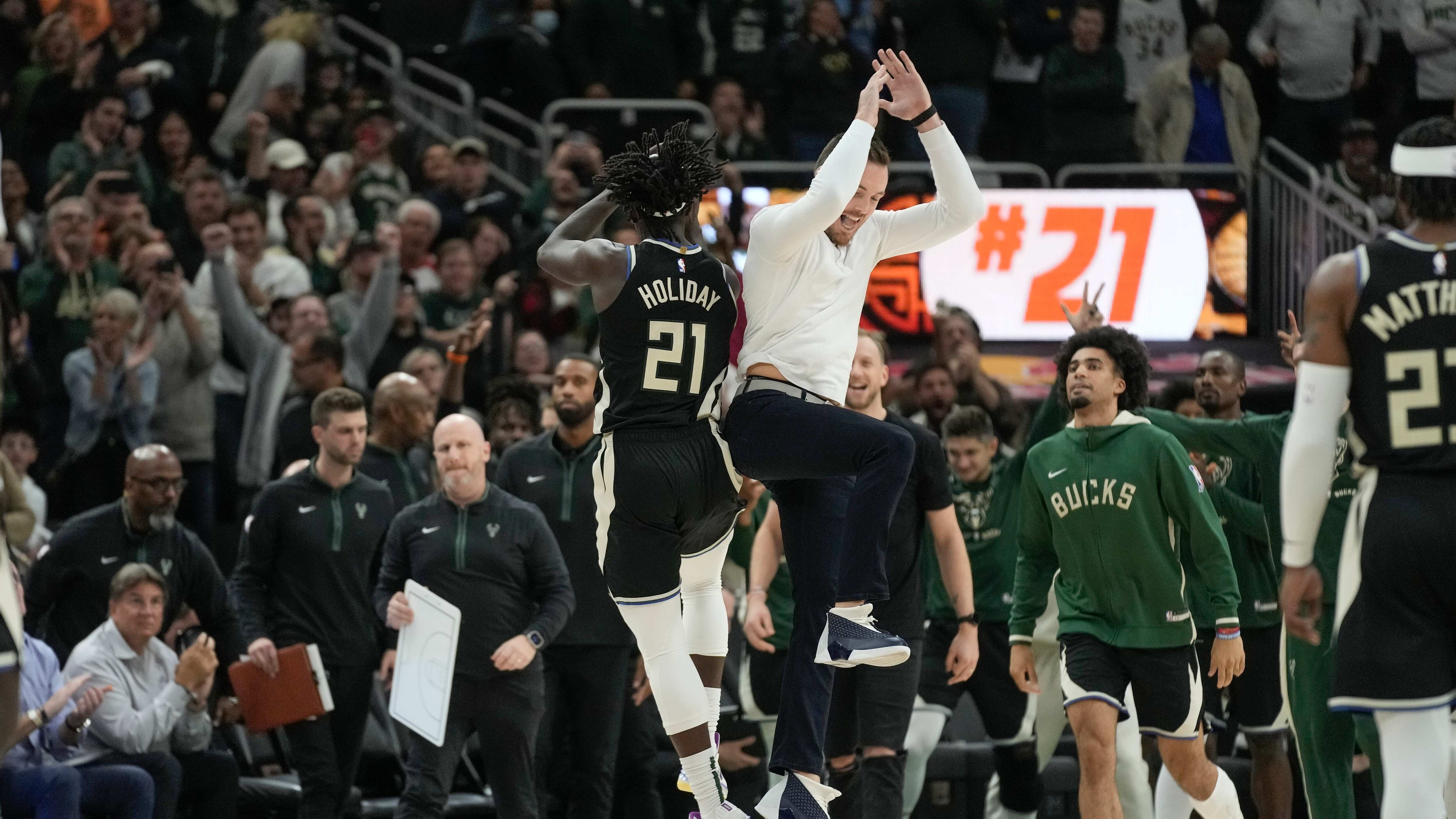 MILWAUKEE, Wisconsin, EE.UU. (AP) — Jrue Holiday conectó un triple para romper el empate a 45,3 segundos del final y terminó con 25 puntos, 10 asistencias y siete rebotes, y los Bucks de Milwaukee superaron el lunes 110-108 a los Pistons de Detroit para mantener su marca invicta.