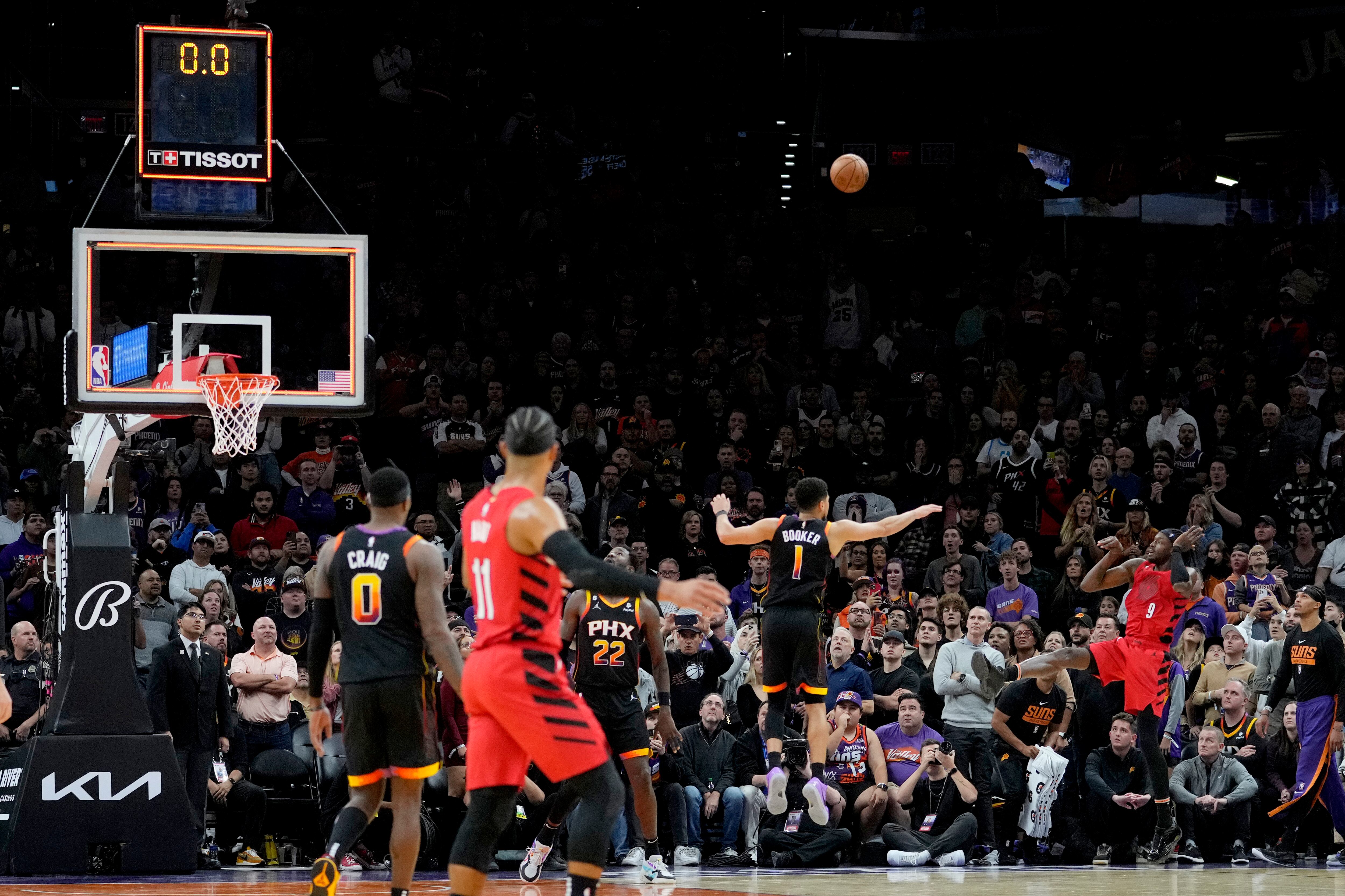 Devin Booker consiguió un triple que le dio la ventaja a los Suns 106-104 con poco más de 30 segundos por jugar, momentos después de que Jusuf Nurkic embocó su propio triple para mandar al frente a los Blazers 104-103.