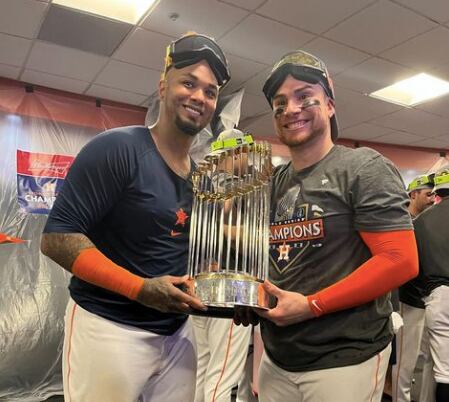 La página MLB Puerto Rico compartió fotos en su cuenta de Instagram de ambos boricuas celebrando el título en el camerino de los Astros.