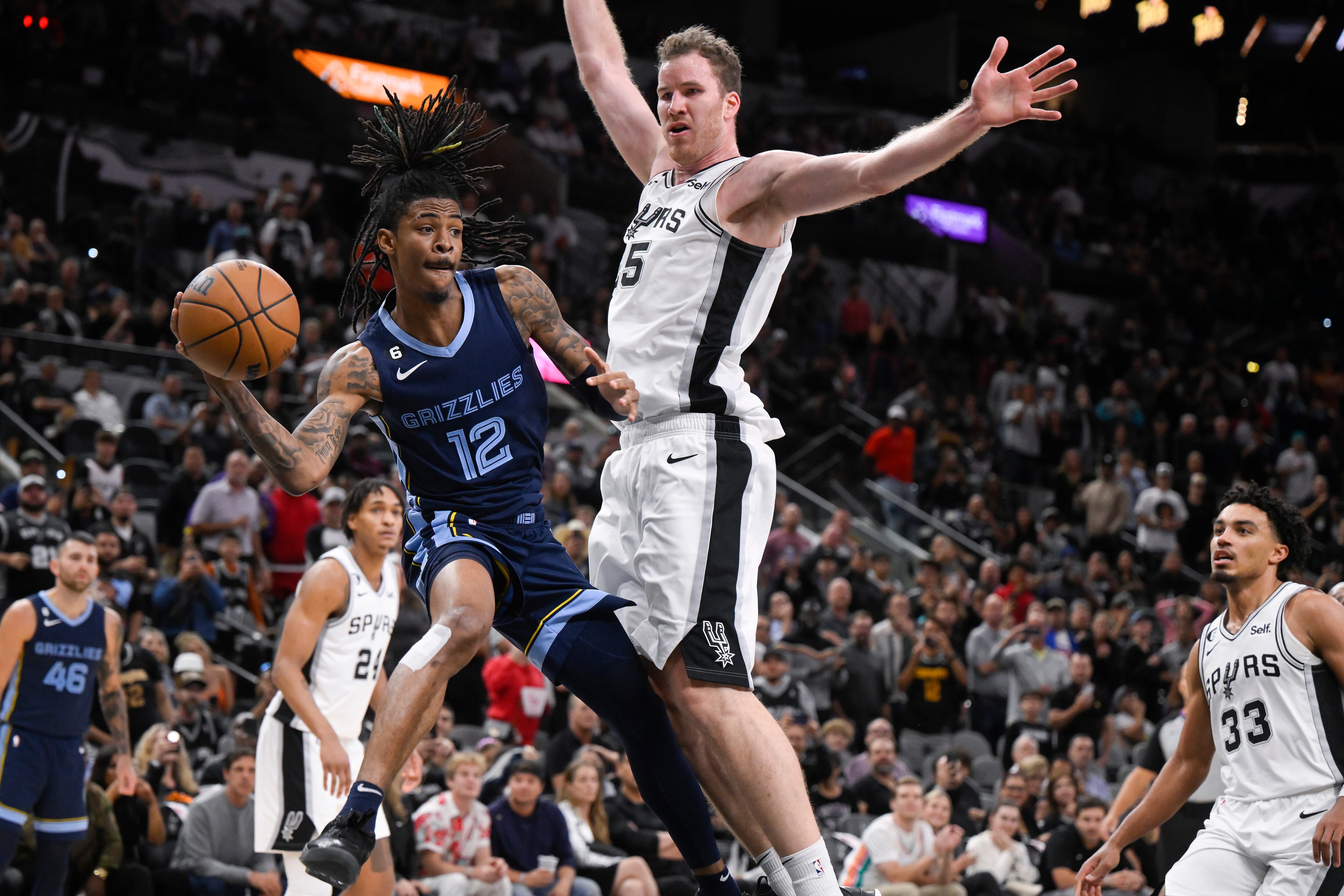 Ja Morant (12), de los Grizzlies de Memphis, busca pasar el balón mientras es defendido por Jakob Poeltl, de los Spurs de San Antonio, durante la segunda mitad del juego de baloncesto de la NBA, el miércoles 9 de noviembre de 2022, en San Antonio. Memph AP (Darren Abate/AP)