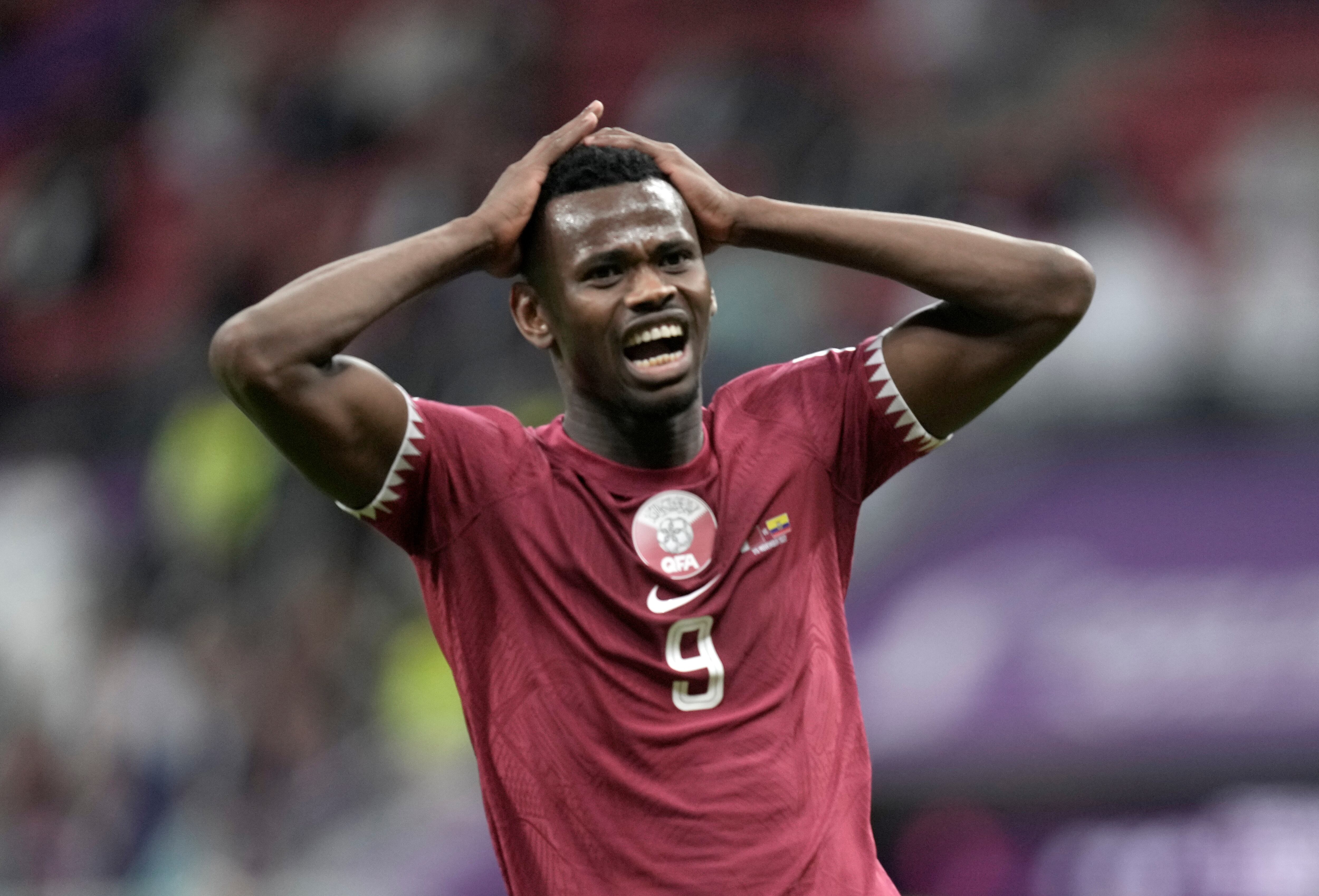 Mohammed Muntari, de Qatar, reacciona tras fallar una ocasión de gol durante el juego del Grupo A del Mundial que enfrentó a la anfitriona con Ecuador, en el estadio Al Bayt, en Jor, el 20 de noviembre de 2022. (AP Foto/Ariel Schalit) AP (Ariel Schalit/AP)