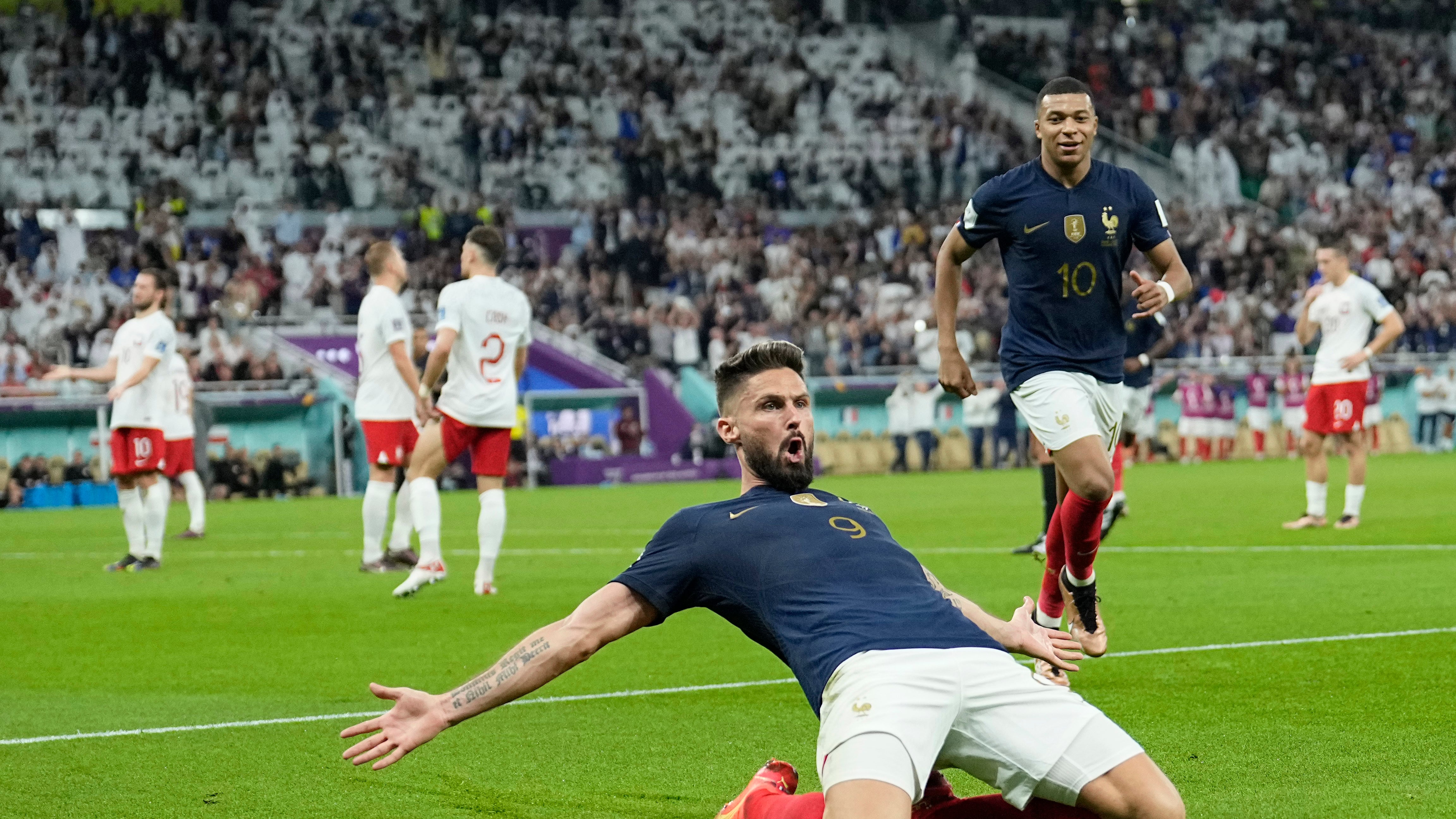 Tras recibir un pase de Kylian Mbappé, Giroud dio la media vuelta en el área y definió de zurda a los 44 minutos para batir al portero polaco Wojciech Szczęsny, su ex compañero de equipo en el Arsenal inglés.