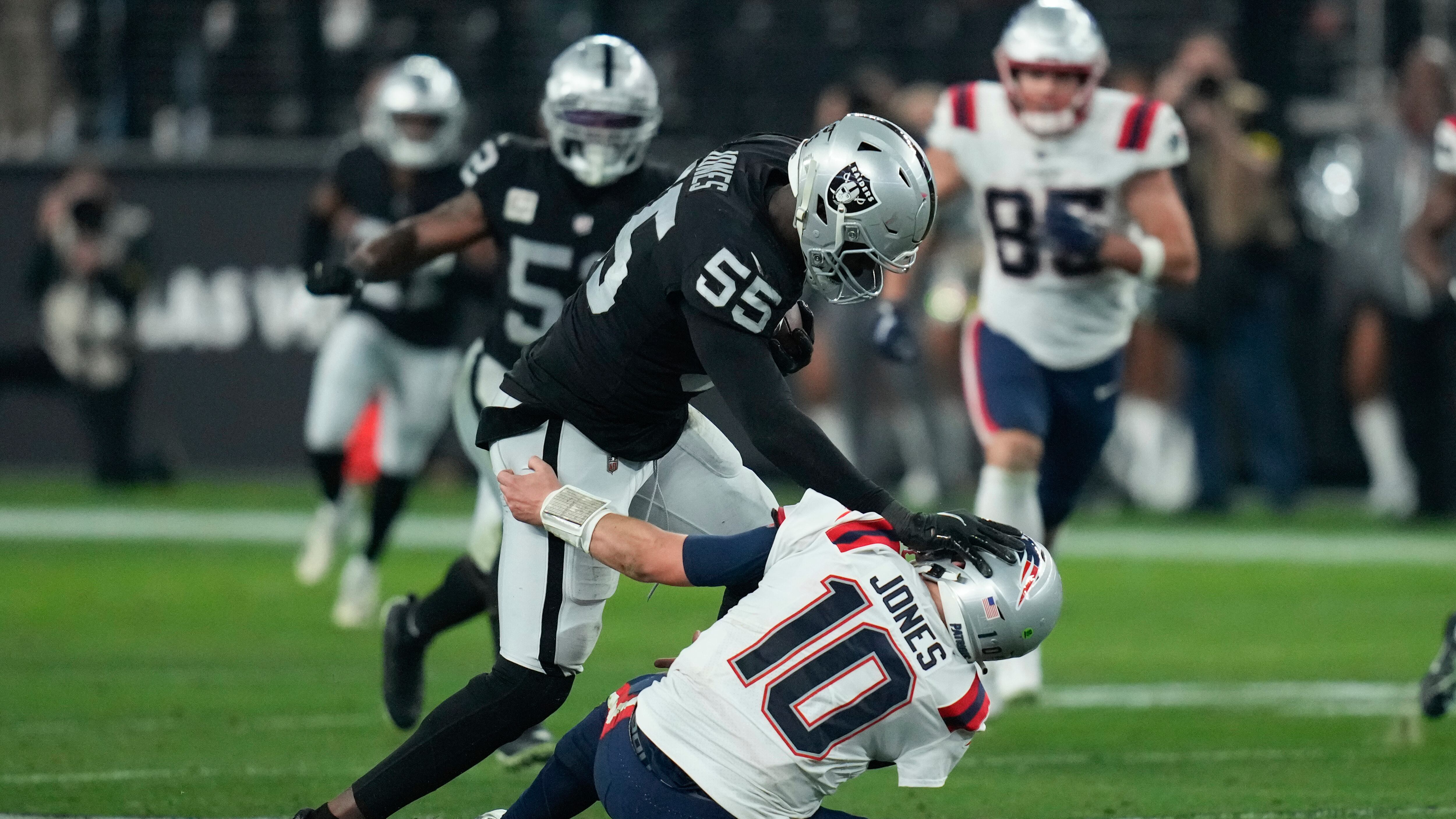 LAS VEGAS (AP) — El defensive end Chandler Jones se robó un extraño e innecesario pase lateral del receptor de Nueva Inglaterra Jakobi Meyers en la última jugada del tiempo regular y lo devolvió 48 yardas hasta la anotación, dándole a los Raiders de Las Vegas la victoria 30-24 sobre los Patriots el domingo.