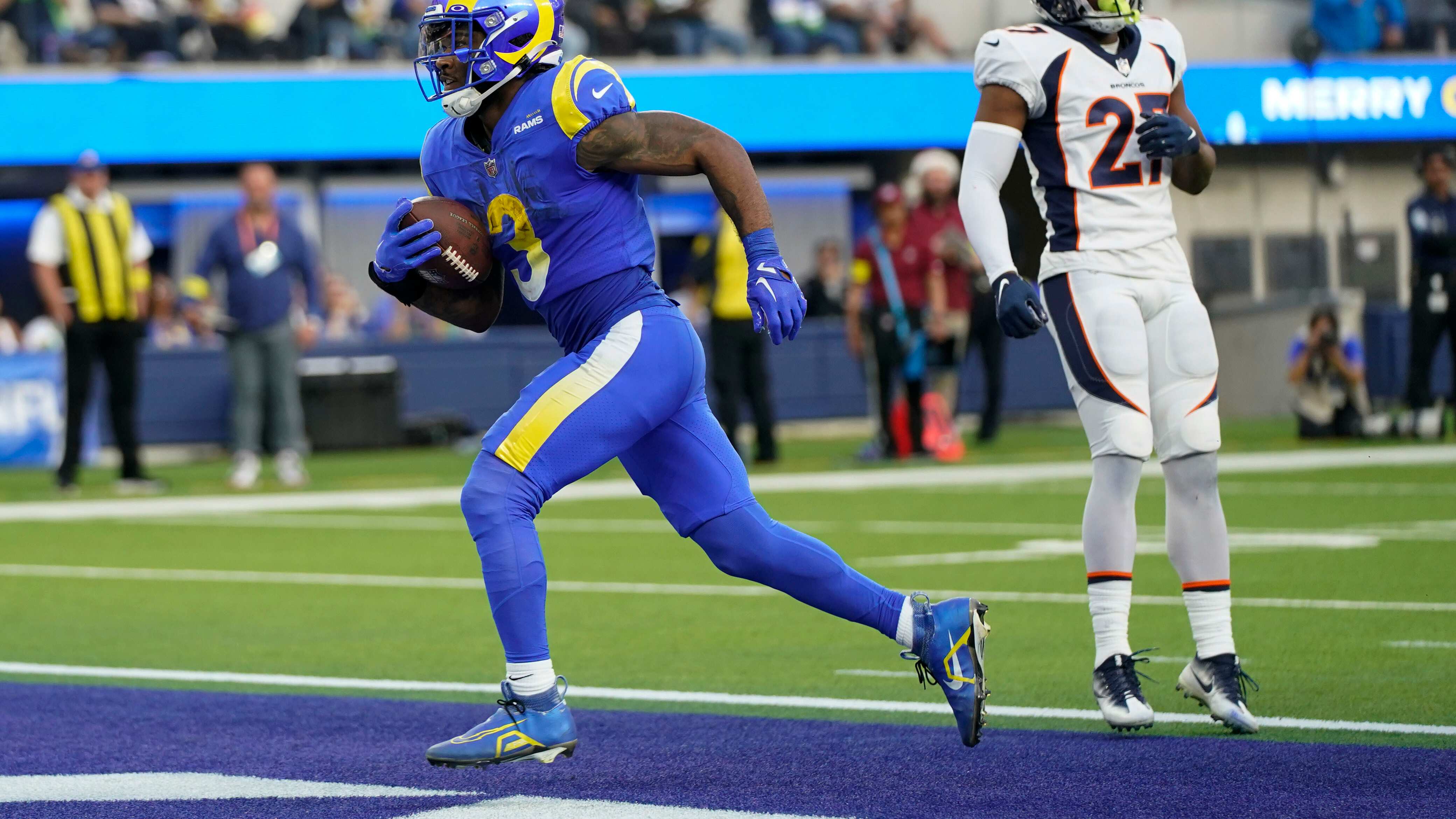El corredor de los Rams de Los Ángeles Cam Akers anotando superando al cornerback de los Broncos de Denver Damarri Mathis en el encuentro del domingo 25 de diciembre del 2022. (AP Foto/Jae C. Hong) AP (Jae C. Hong/AP)