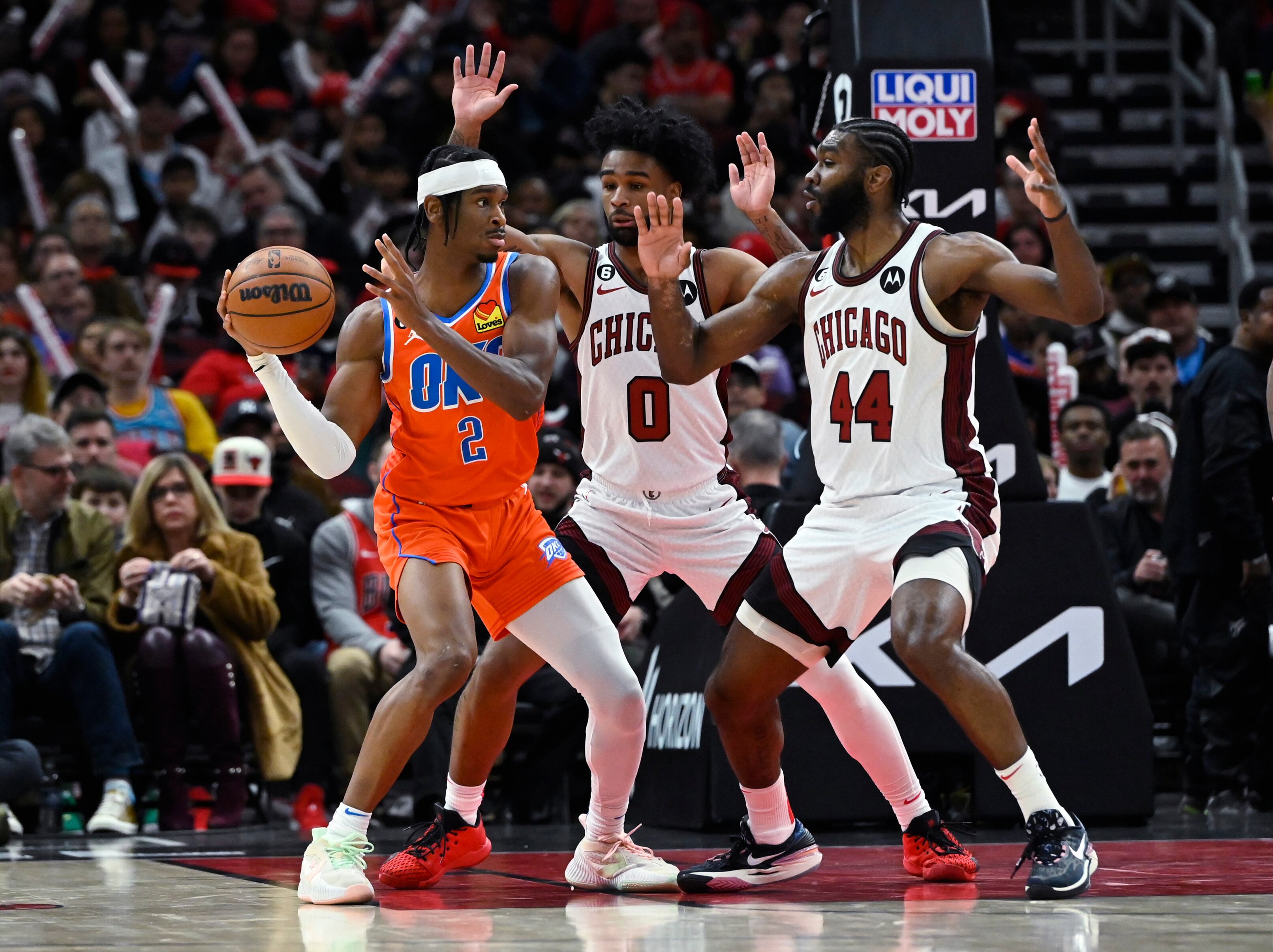 Shai Gilgeous-Alexander (2), del Thunder de Oklahoma City, pasa el balón lejos de Coby White (0) y Patrick Williams (44), de los Bulls de Chicago, durante la segunda mitad del juego de baloncesto de la NBA, el viernes 13 de enero de 2023, en Chicago. (AP AP (Matt Marton/AP)