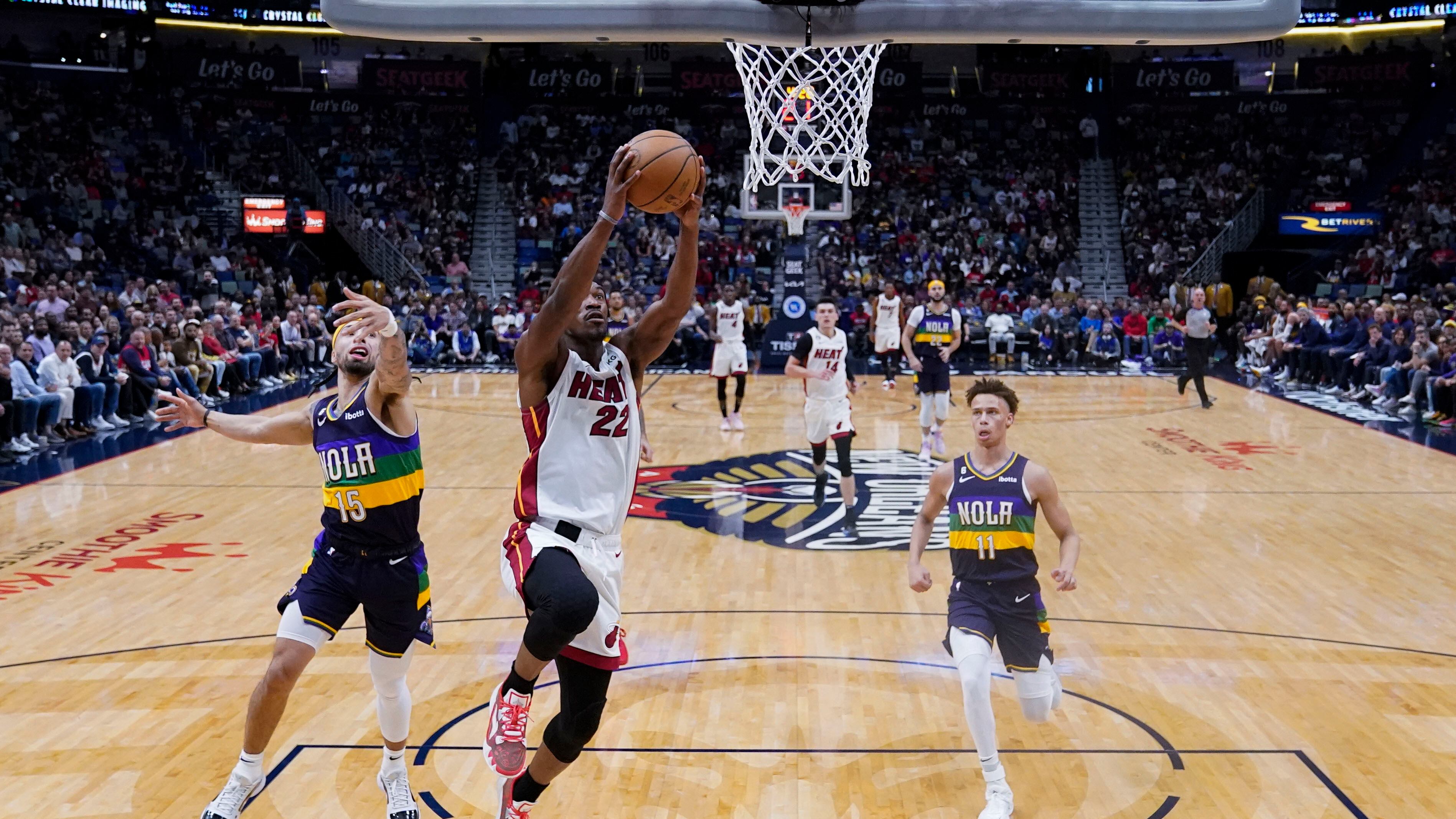 Jonas Valanciunas totalizó 18 puntos y 10 rebotes por Nueva Orleáns, que recortó brevemente una desventaja de 19 puntos en el intermedio a 12 en el tercer periodo, antes de que Miami se despegara de nuevo.