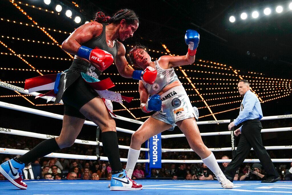 Amanda Serrano vs Erika Cruz 4 de febrero de 2023; Nueva York, Nueva York, EE. UU.; Amanda Serrano y Erika Cruz durante su pelea por el Campeonato Mundial Indiscutible de Peso Pluma en el Teatro Hulu en el Madison Square Garden en Nueva York, Nueva York. Crédito obligatorio: Ed Mulholland/Matchroom. (Ed Mulholland/Matchroom./Ed Mulholland/Matchroom.)