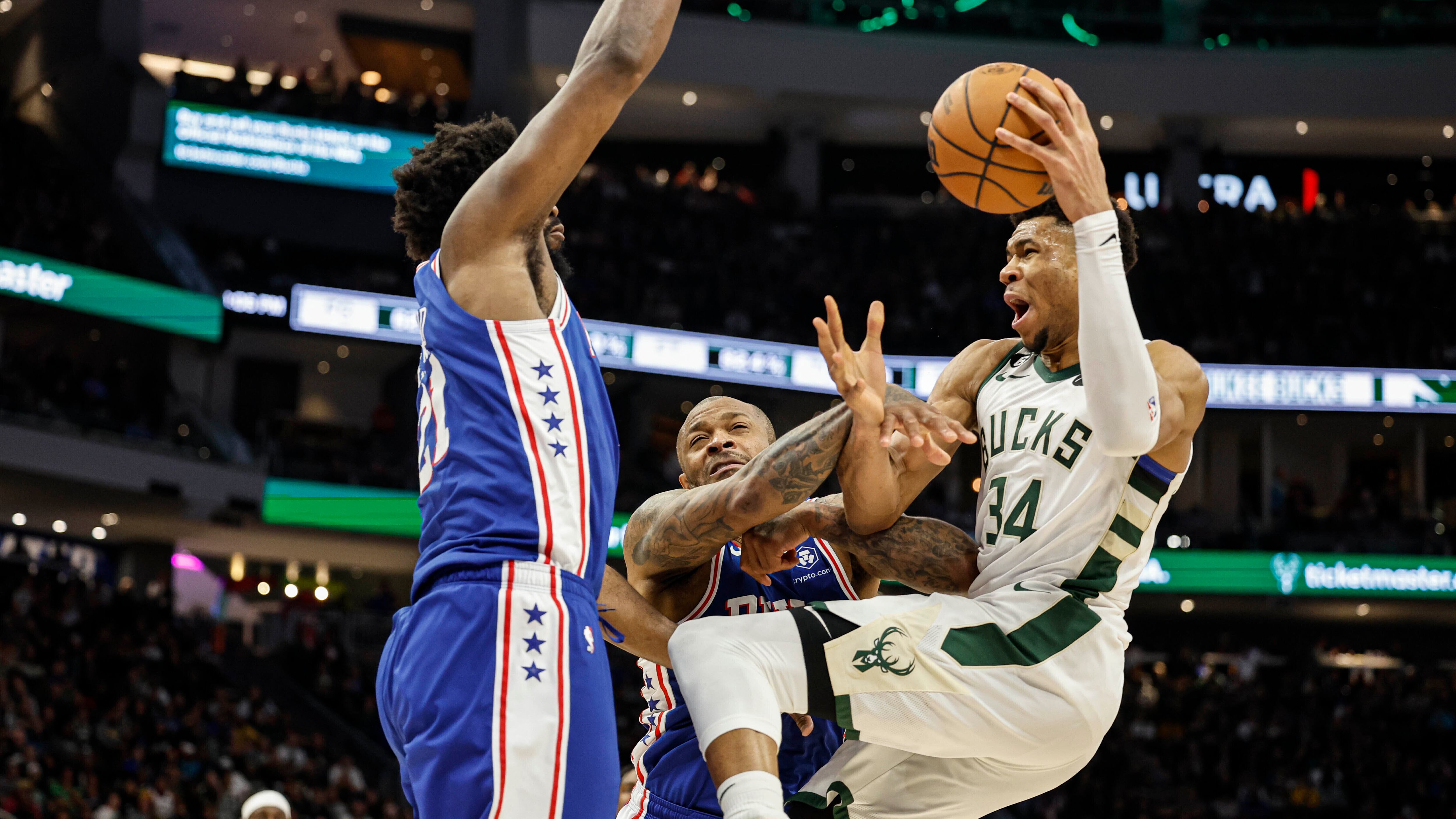 MILWAUKEE (AP) — Giannis Antetokounmpo totalizó 33 puntos, 14 rebotes y seis asistencias para ayudar a que los Bucks de Milwaukee doblegaran el domingo 117-104 a los 76ers de Filadelfia, con lo cual se acercaron a la conquista del primer sitio de la Conferencia Este.