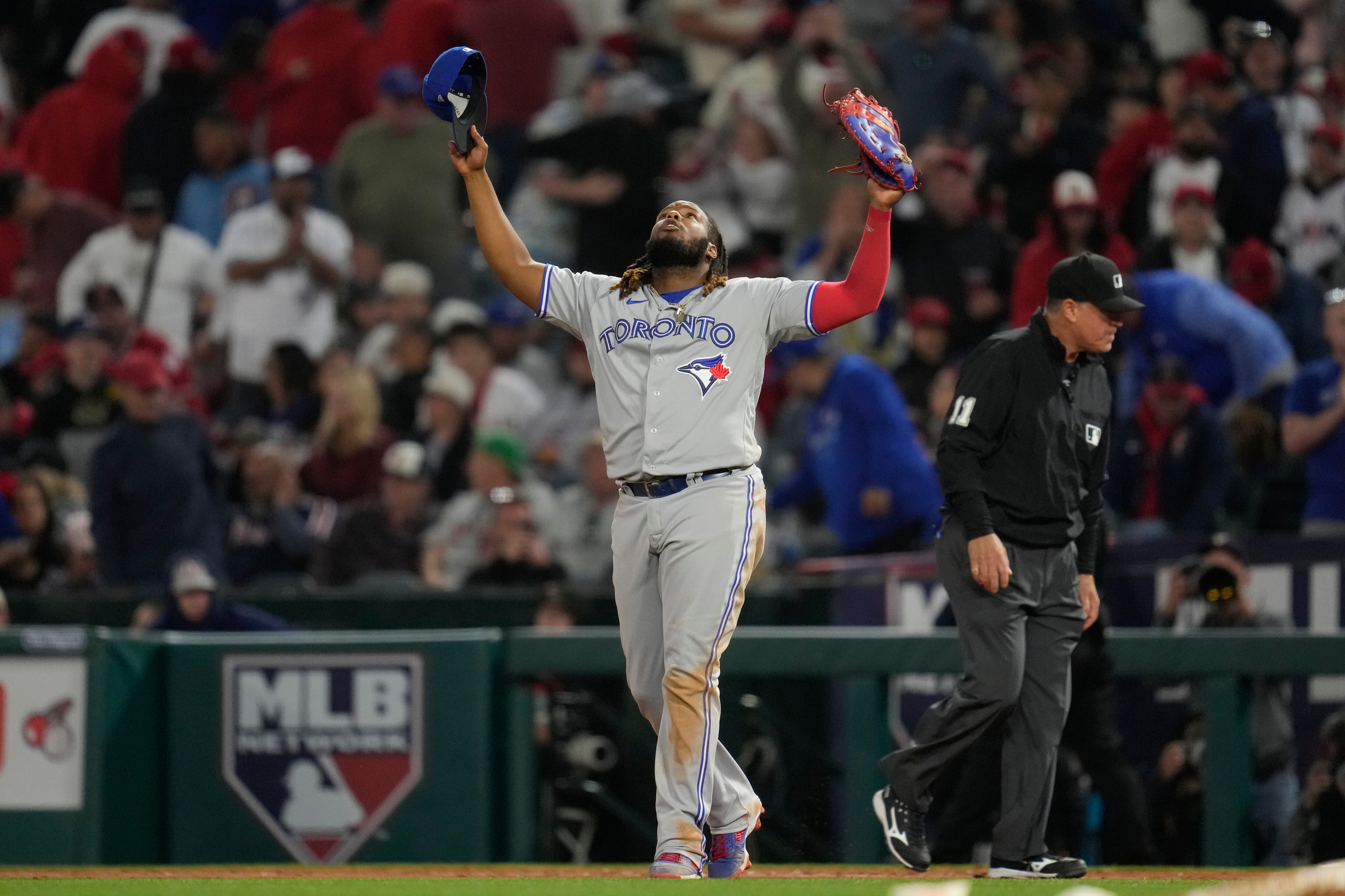 El dominicano Vladimir Guerrero, de los Azulejos de Toronto, festeja luego de conseguir el último out del duelo del viernes 7 de abril de 2023, ante los Angelinos de Los Ángeles (AP Foto/Ashley Landis) AP (Ashley Landis/AP)