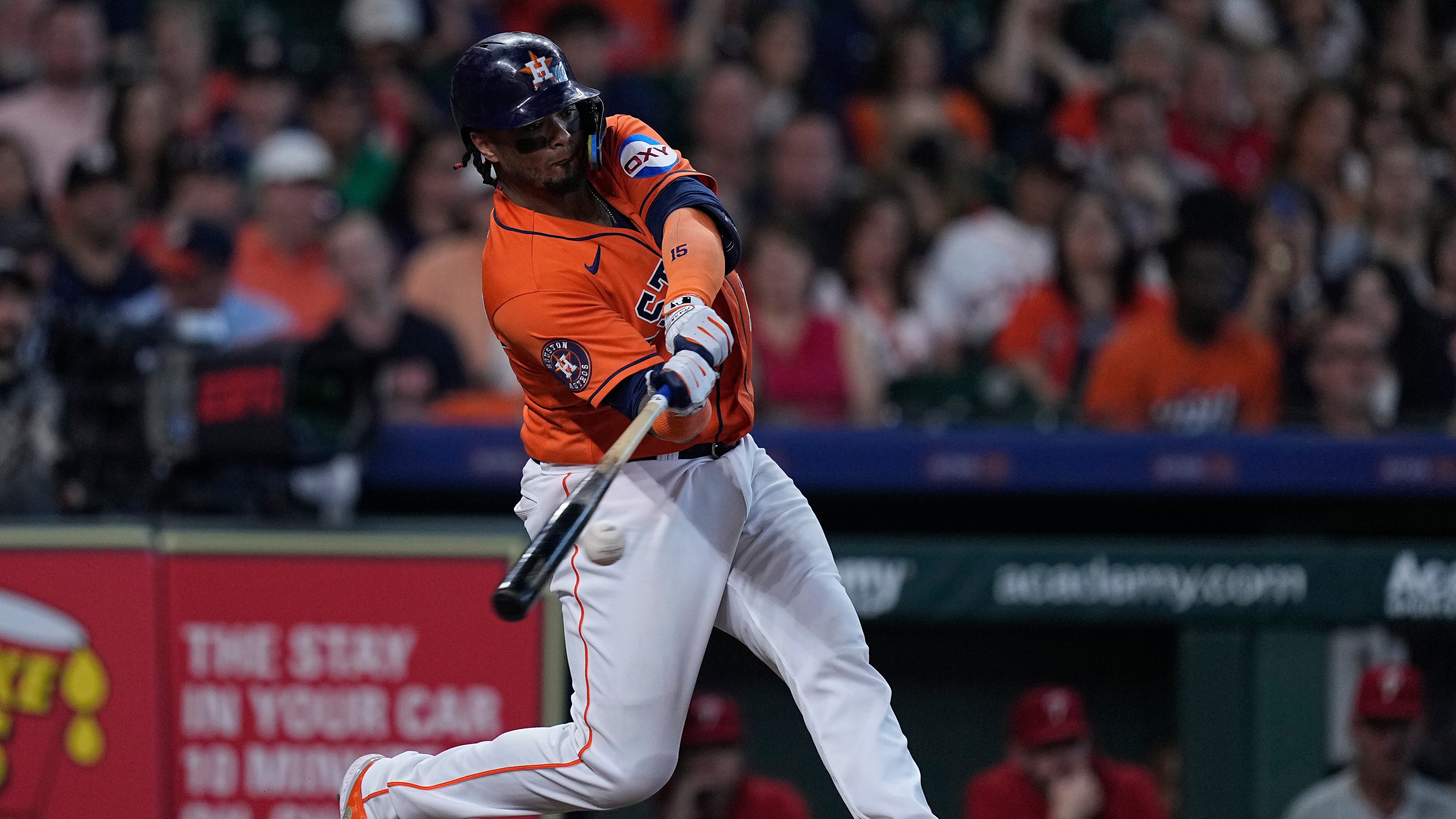 Martin Maldonado, de los Astros de Houston, pega doble productor durante la segunda entrada del juego de béisbol en contra de los Filis de Filadelfia, el domingo 30 de abril de 2023, en Houston. (AP Foto/Kevin M. Cox) AP (Kevin M. Cox/AP)