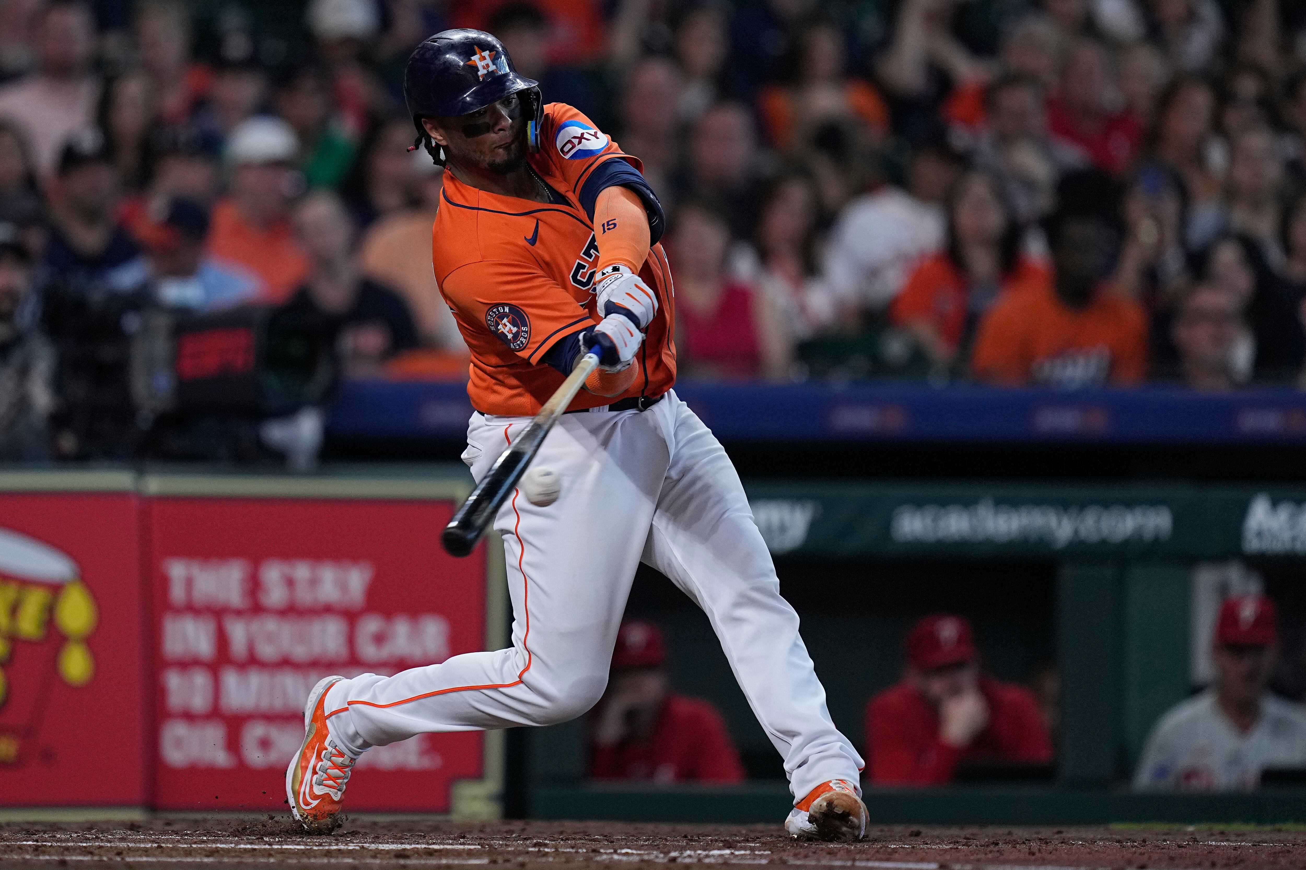Martin Maldonado, de los Astros de Houston, pega doble productor durante la segunda entrada del juego de béisbol en contra de los Filis de Filadelfia, el domingo 30 de abril de 2023, en Houston. (AP Foto/Kevin M. Cox) AP (Kevin M. Cox/AP)