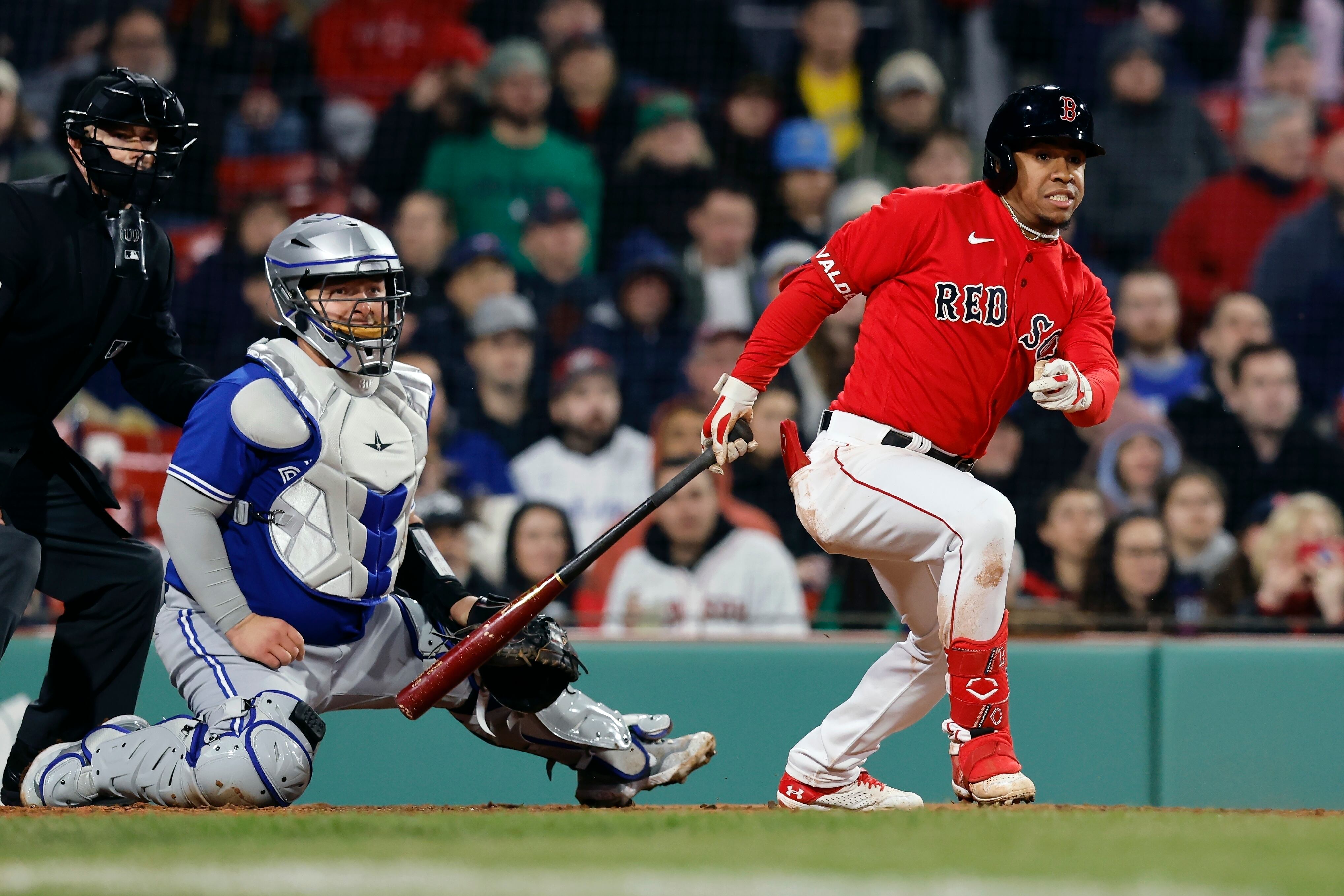 Devers llegó a la intermedia cuando el cátcher mexicano Alejandro Kirk se apoderó de la pelota y tiró al jardín derecho.