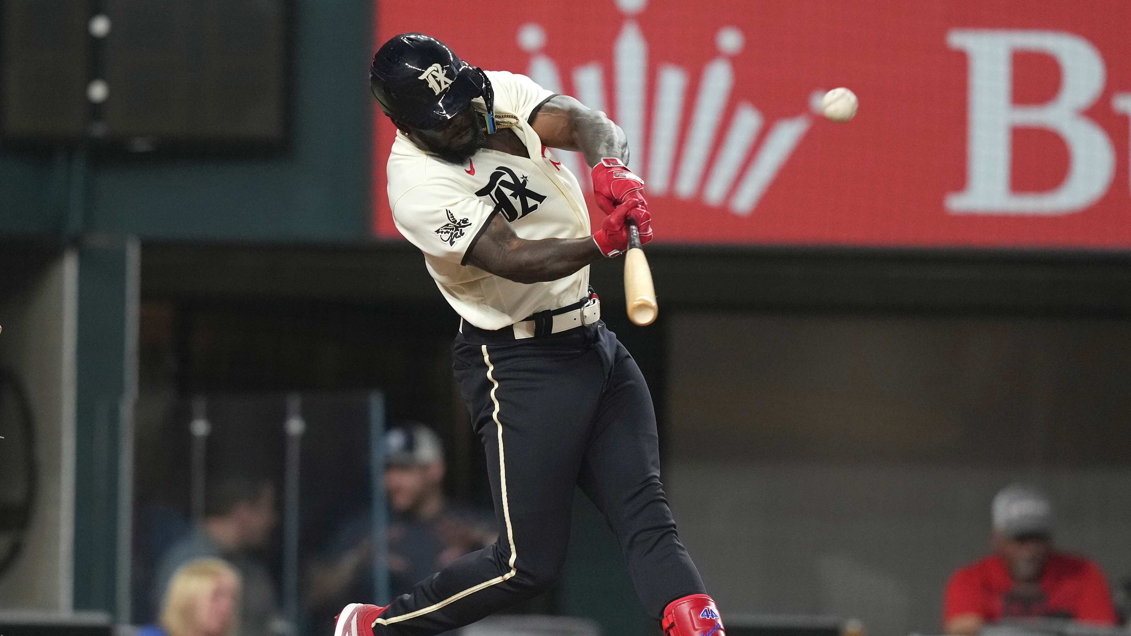 El jonrón de García al jardín contrario —el derecho— abrió la pizarra en la cuarta. Fue su 14to cuadrangular, con lo que es líder de la Americana y llegó a 48 carreras producidas, encabezando las mayores. Bateó dos jonrones en su partido previo y lleva cinco en los últimos cinco encuentros.