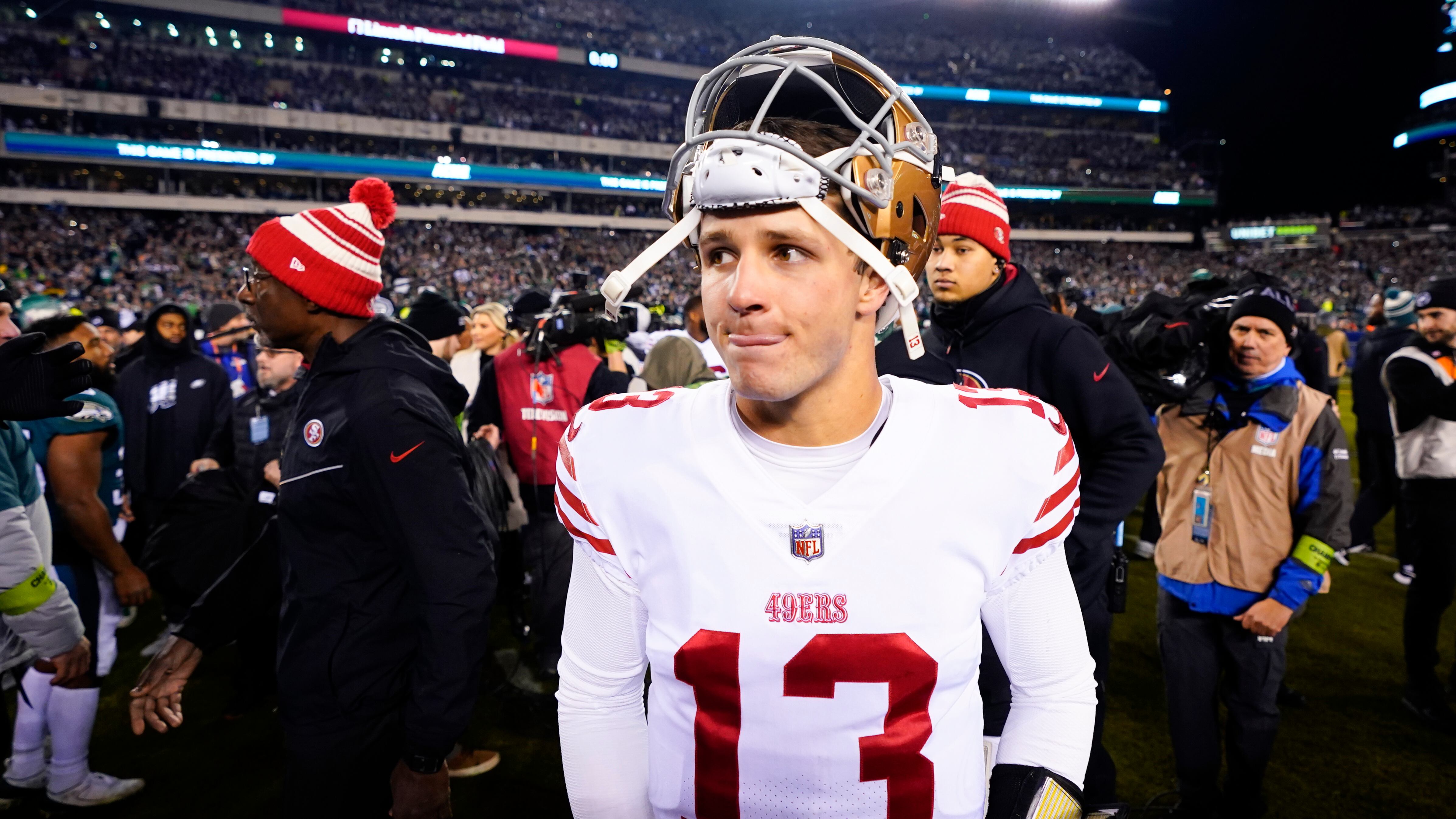 San Francisco puso al corredor Christian McCaffrey a calentar el brazo durante el juego de campeonato ante Filadelfia, esto después de que Brock Purdy se lesionó el brazo y Josh Johnson sufrió una conmoción. Purdy tuvo que volver al partido, pero no pudo lanzar más de 10 yardas y los 49ers cambiaron su estrategia al juego por tierra en la derrota por 31-7 el 29 de enero.