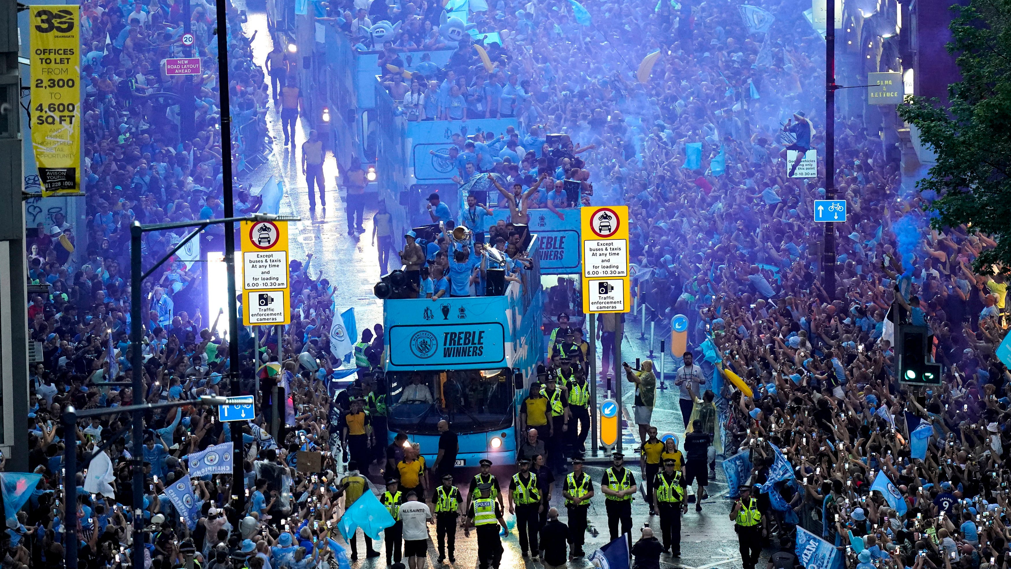 El inicio del desfile se aplazó debido a lo que el City calificó como “condiciones meteorológicas adversas y tormentas eléctricas”, pero los dos autobuses azules —con las trofeos de la Liga Premier, la Copa FA y la Liga de Campeones a bordo— eventualmente comenzaron su trayecto sobre las calles de la ciudad. Los jugadores y el mánager Pep Guardiola portaron una camiseta con la frase “Ganadores de la Tripleta”, en inglés.