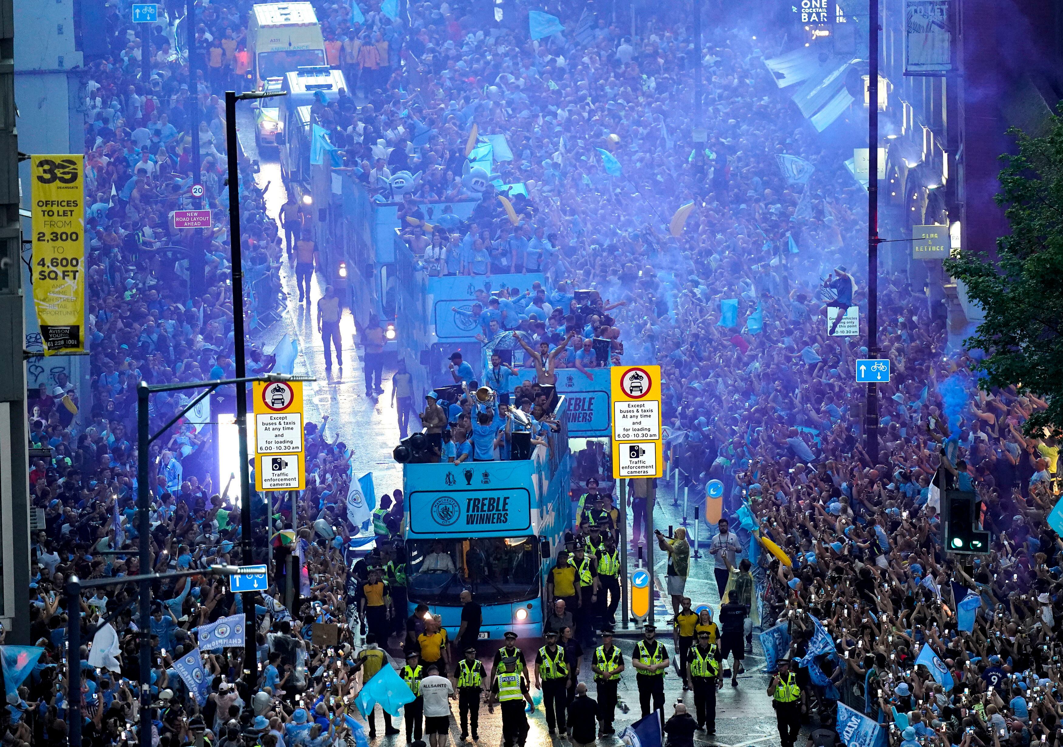 El inicio del desfile se aplazó debido a lo que el City calificó como “condiciones meteorológicas adversas y tormentas eléctricas”, pero los dos autobuses azules —con las trofeos de la Liga Premier, la Copa FA y la Liga de Campeones a bordo— eventualmente comenzaron su trayecto sobre las calles de la ciudad. Los jugadores y el mánager Pep Guardiola portaron una camiseta con la frase “Ganadores de la Tripleta”, en inglés.