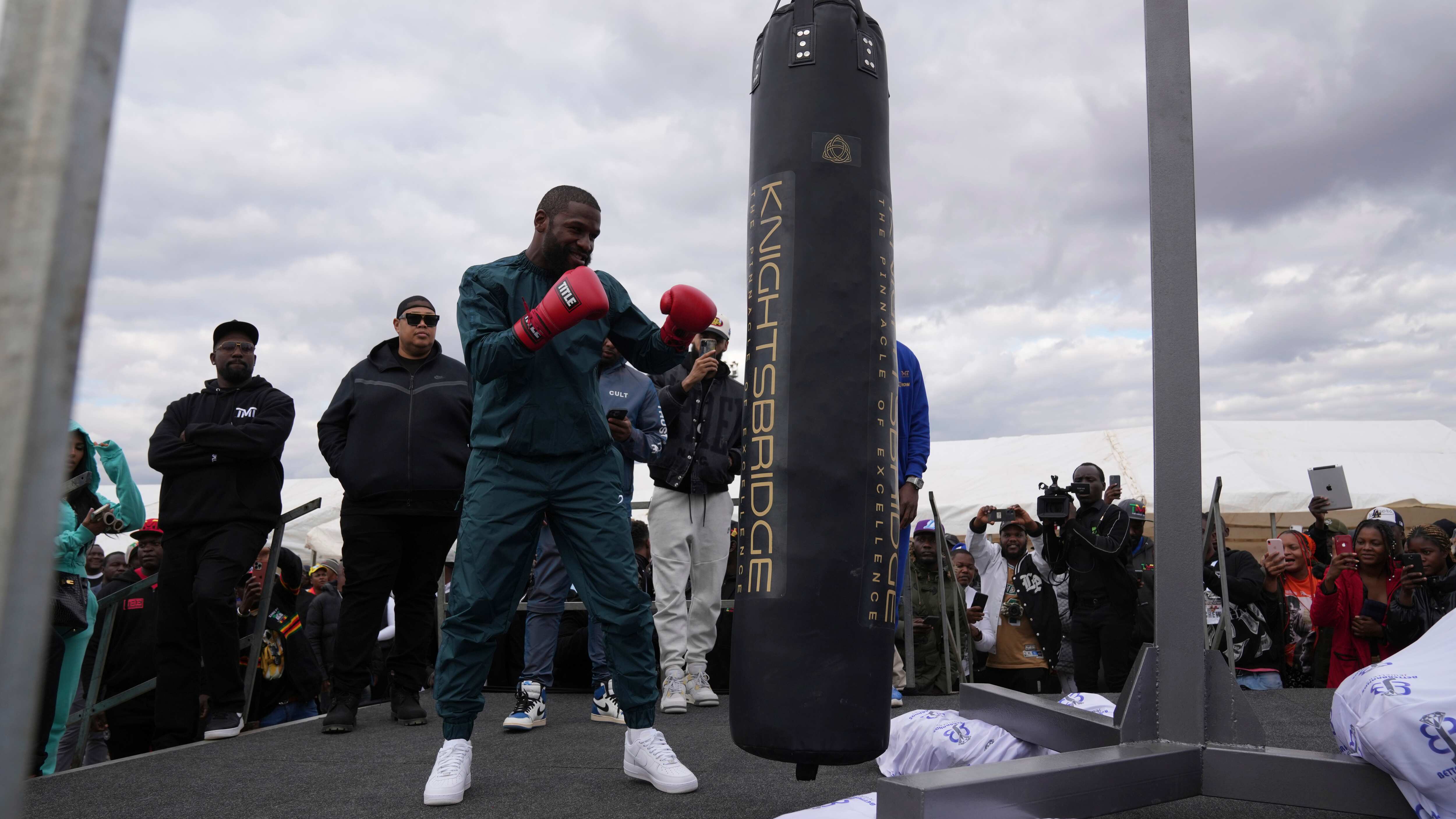 Cientos de personas corearon “Mayweather mbinga... mbinga” (Mayweather... el tipo rico) cuando el expúgil de 46 años, quien ha ganado títulos en cinco divisiones con una foja de 50-0 en su carrera, propinó golpes a un saco y realizó otras actividades de exhibición.