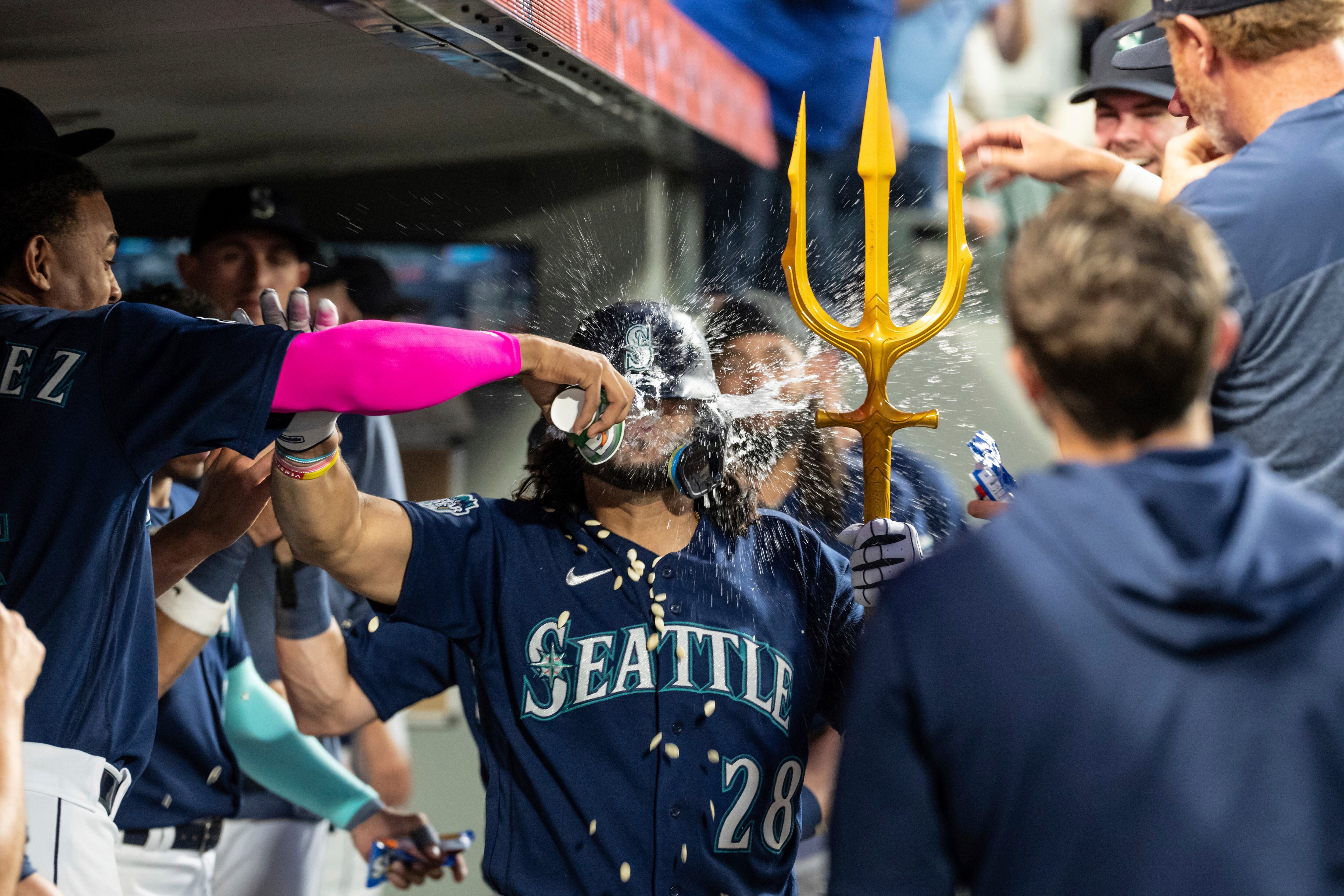 Por los Marineros, los dominicanos Julio Rodríguez de 3-0 con una empujada, Teoscar Hernández de 4-1 con una anotada. El venezolano Eugenio Suárez de 4-2 con una anotada y dos impulsadas. El panameño José Caballero de 3-1 con una anotada y una remolcada.