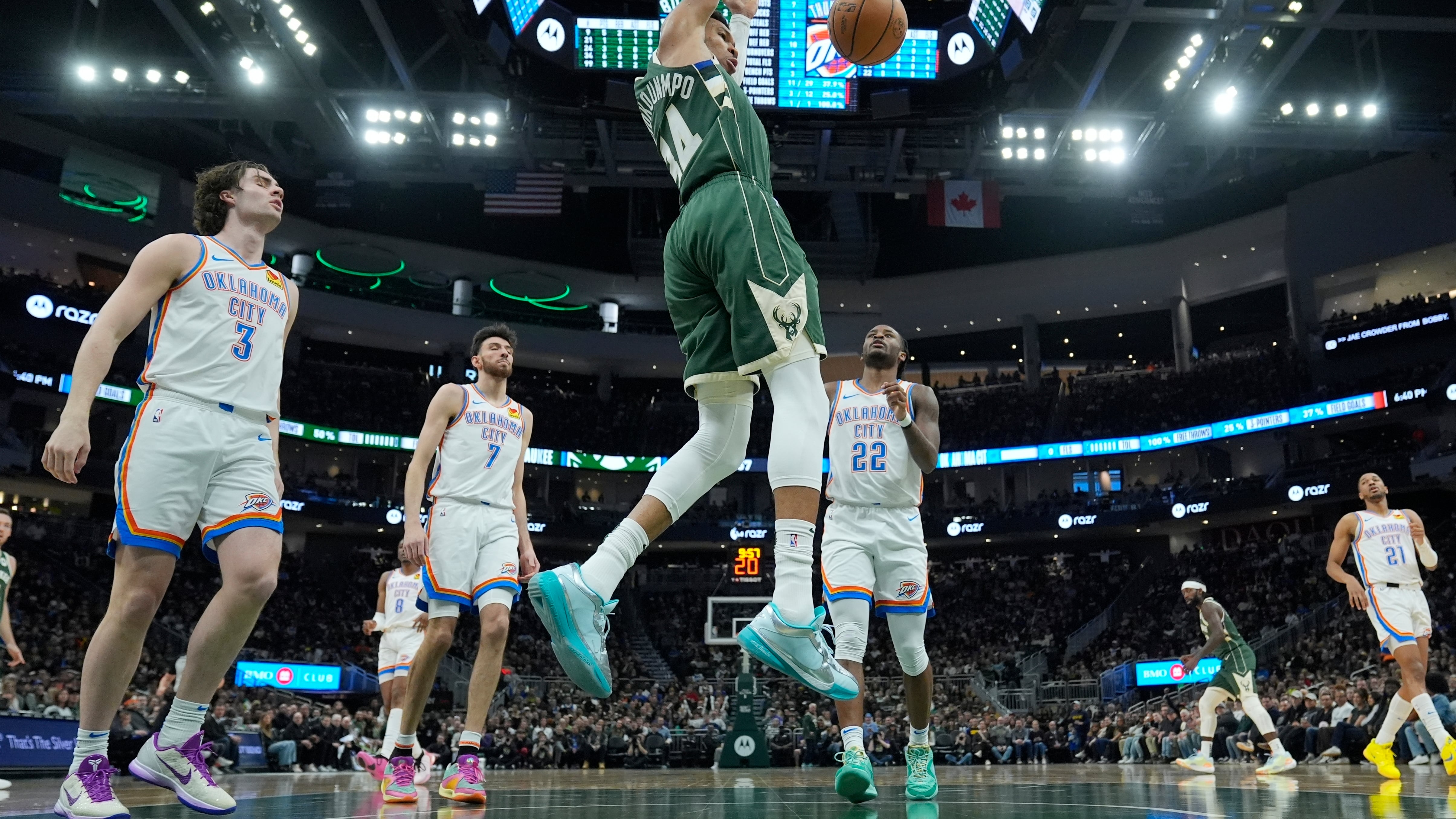 Oklahoma City tuvo la menor cantidad de puntos y el porcentaje de tiro (.371) más bajo de la campaña. Shai Gilgeous-Alexander contó con 12 puntos —la primera vez desde el 19 de enero que tuvo menos de 20— y fue enviado a la banca todo el cuarto periodo debido a que los Bucks tenían una amplia ventaja.